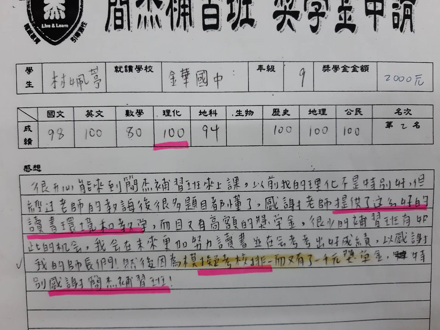 楊同學 開來簡杰補習之前段考40-60分 簡杰補習之後超過80分或90分 高中成績 數學全班最高分 班排第二名 全校年級排前5名