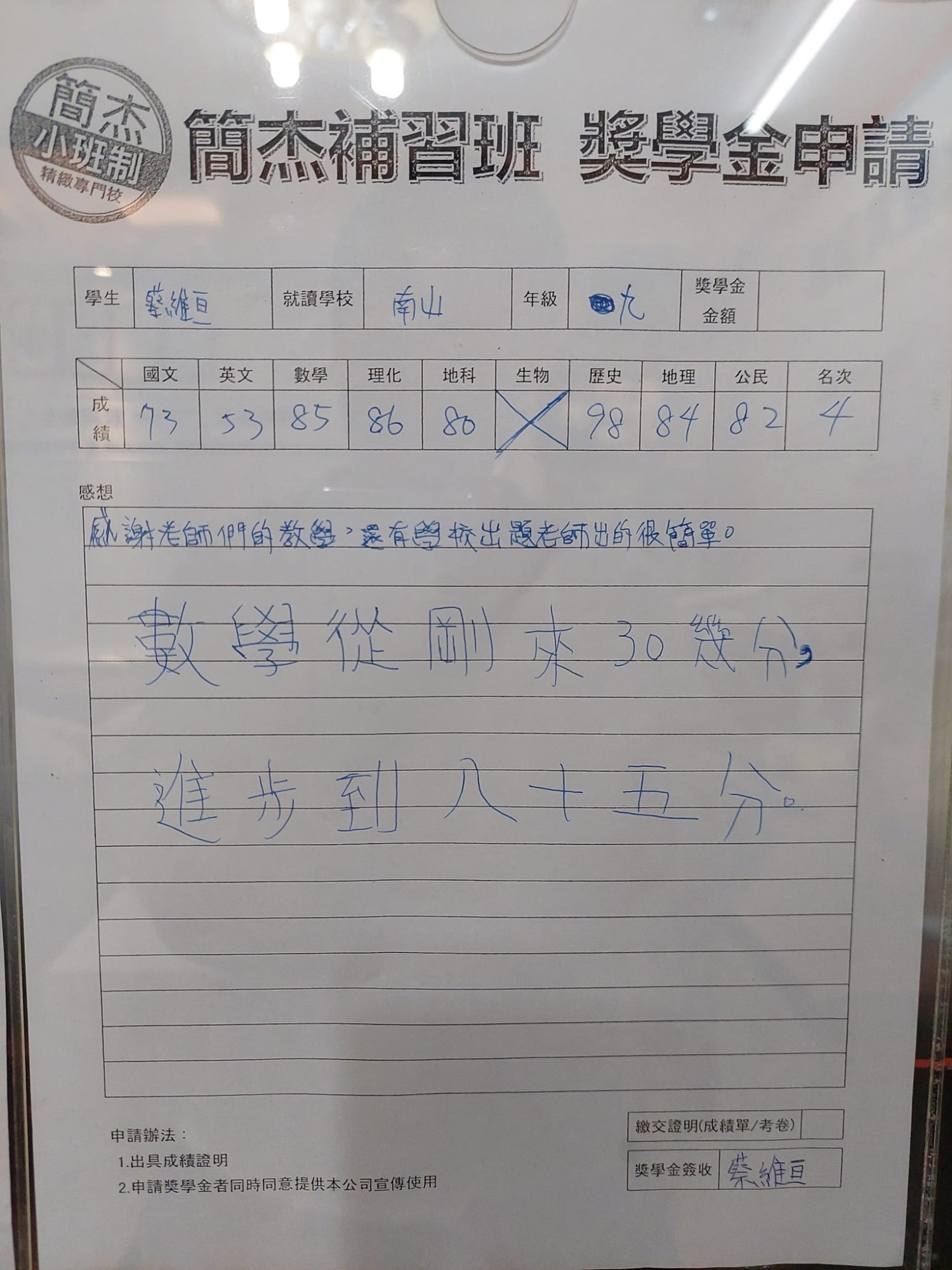 市立金華國中 國九 鄭*宏 史96分理96分公94分