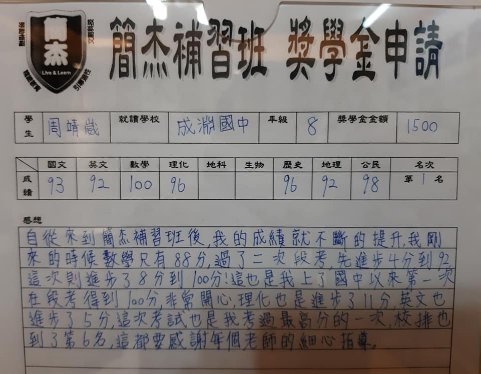 市立成淵中學 國九 周*崴史100分地98分 公94分