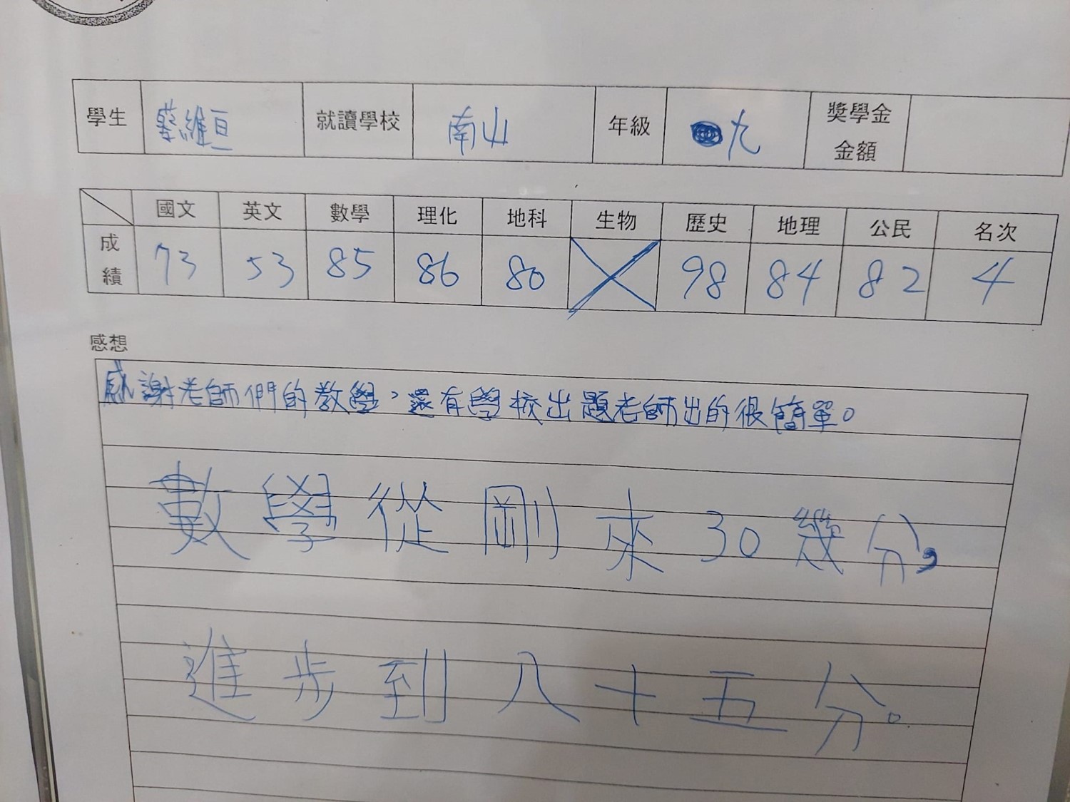 薇閣國中 九年級 柏佑 數學 56 ➤ 92 +36分(直升)