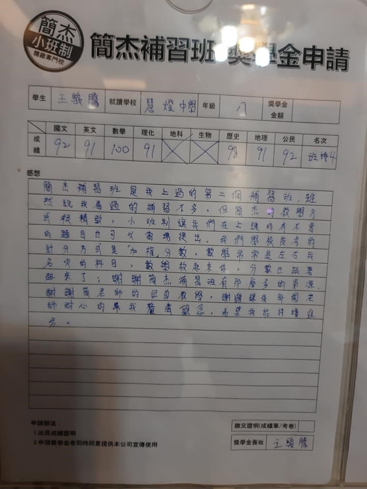 薇閣國中 九年級 柏佑 數學 56 ➤ 92 +36分(直升)