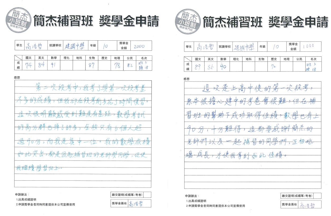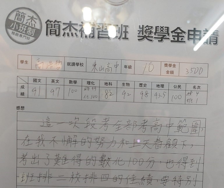 楊同學 開來簡杰補習之前段考40-60分 簡杰補習之後超過80分或90分 高中成績 數學全班最高分 班排第二名 全校年級排前5名