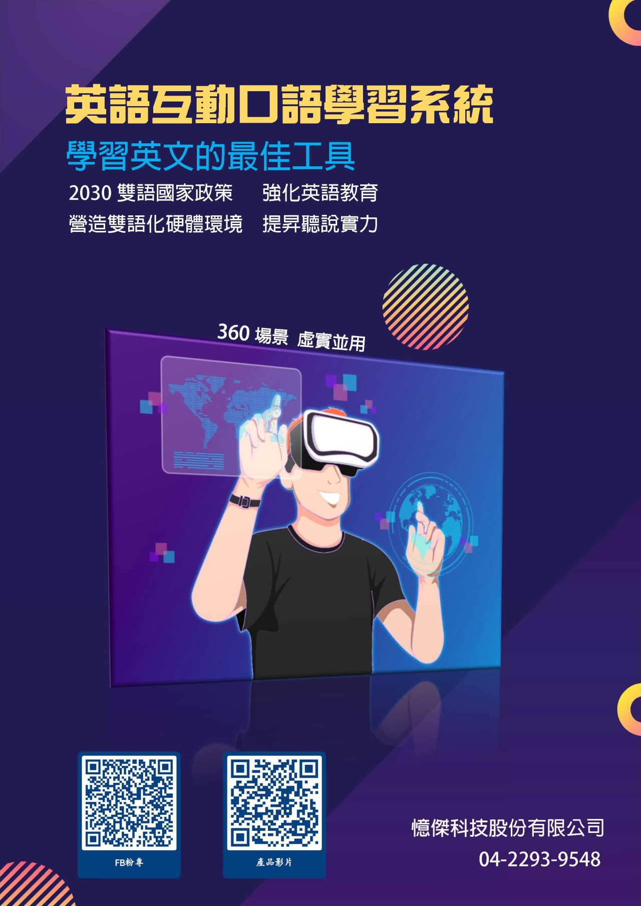戴上VR裝置後,進入360度的虛擬世界,更可進行一對一的英文口頭對話練習,突破了『不敢開口說英文』的困境。