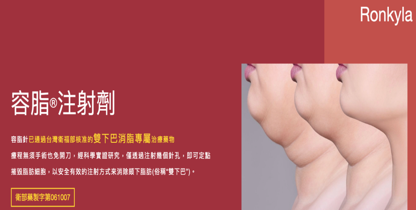 Ronkyla容脂注射劑又稱容脂針,已通過台灣衛福部核准的雙下巴消脂專屬治療藥物,療程無須手術也不用開刀,經科學研究只需要透過注射即可定點摧毀脂肪細胞,以安全有效的方式來消除雙下巴。