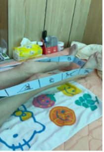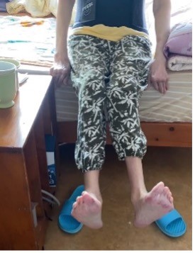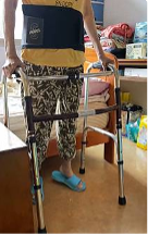 服務初時千奶奶雙腿無力,躺在床上做運動對她而言較容易又安全,故珈如計畫從床上關節運動開始,包括膝關節彎曲伸直及髖關節的轉圈運動,兩個禮拜後請兒子買來彈力帶,開始進行床上阻抗運動以增加肌耐力,下一步則開始練習移位,如此循序漸進,9/4千奶奶在出院後第一次離開自己房間,拿著助行器走到客廳坐下(見圖)。