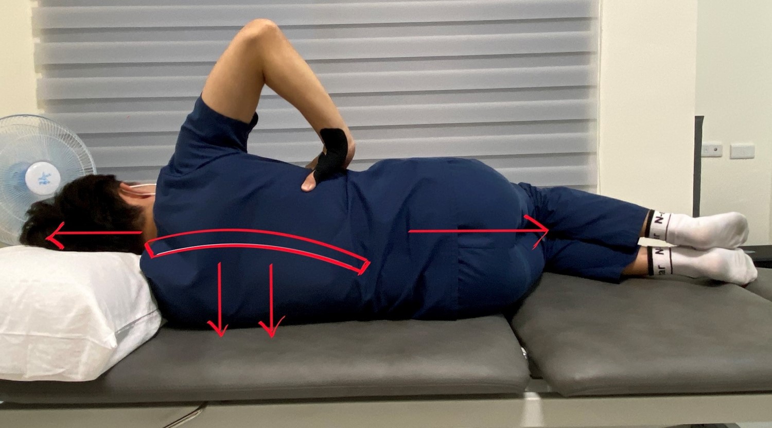 擺位原則把凹邊打開,利用重力調整脊椎,所以建議左側躺為主。