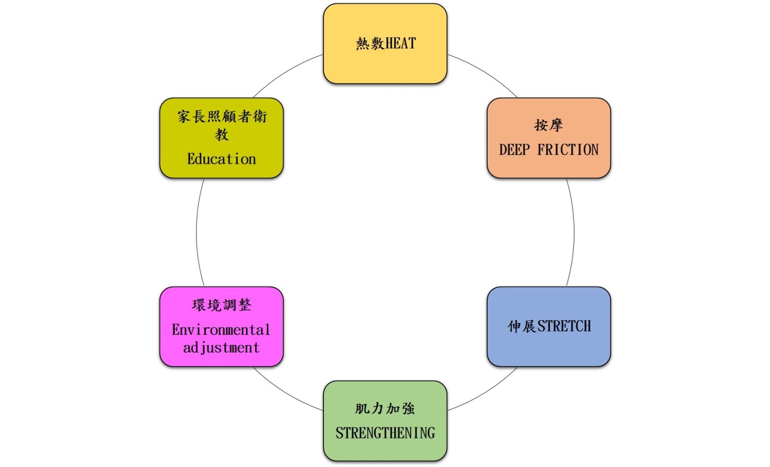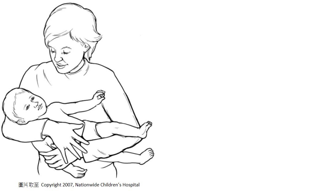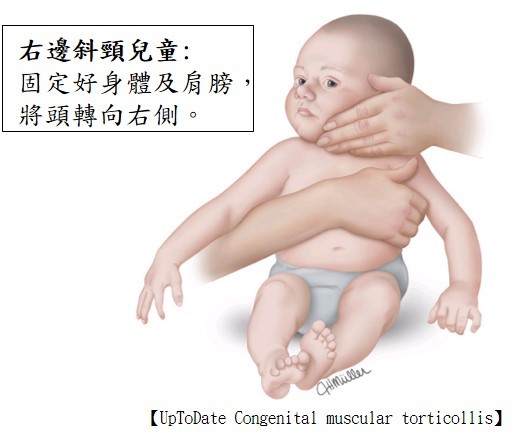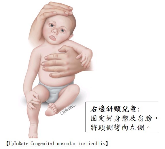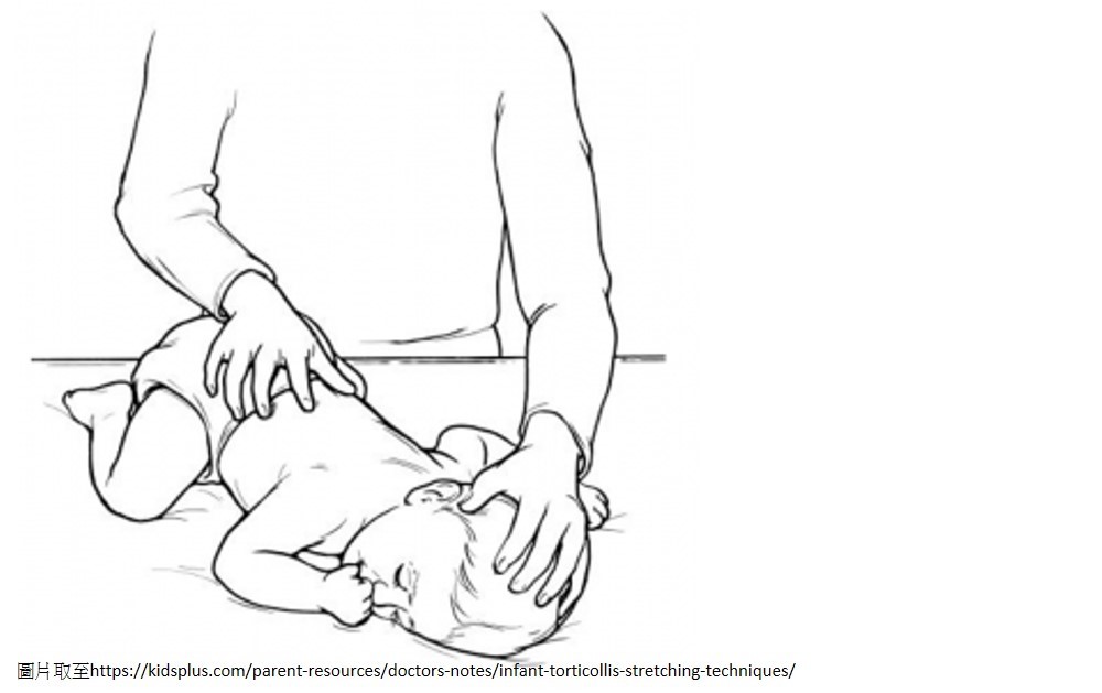 - 攜抱方式:【右邊斜頸兒童】利用右手幫小孩做向左邊側彎的伸展 。