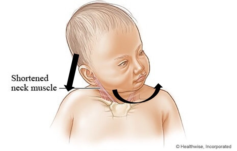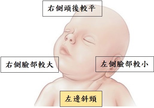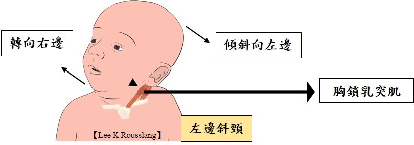 肌肉性斜頸:這是最常見的斜頸類型,主要是因為頸部的「胸鎖乳突肌」攣縮或纖維化所造成的歪斜。若是左側的攣縮,則嬰兒的頭部會傾向左側,而下巴則斜向右側。