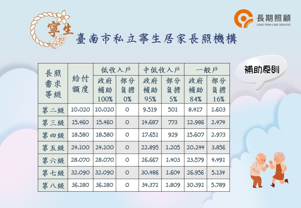 由社會局專員協助評估長照使用者之 失能等級 - 二~八級、補助費用 - 10,020~36,180、部分負擔 - 一般戶16% 中低收5% 低收0%