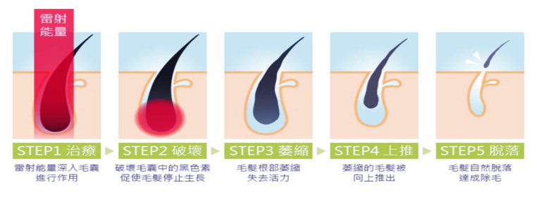 人體毛髮生長分3個時期:成長期、退化期及休止期,當毛髮處成長階段時,毛囊黑色素含量較高,雷射效果較好。人體毛髮中,這3個時期是並存的,因此需要分次除毛,才能達到最佳效果。整個完整療程須6-10次,每次治療間隔4-6週。1次治療約有2成效果,6次可減少約6-7成的總毛量。