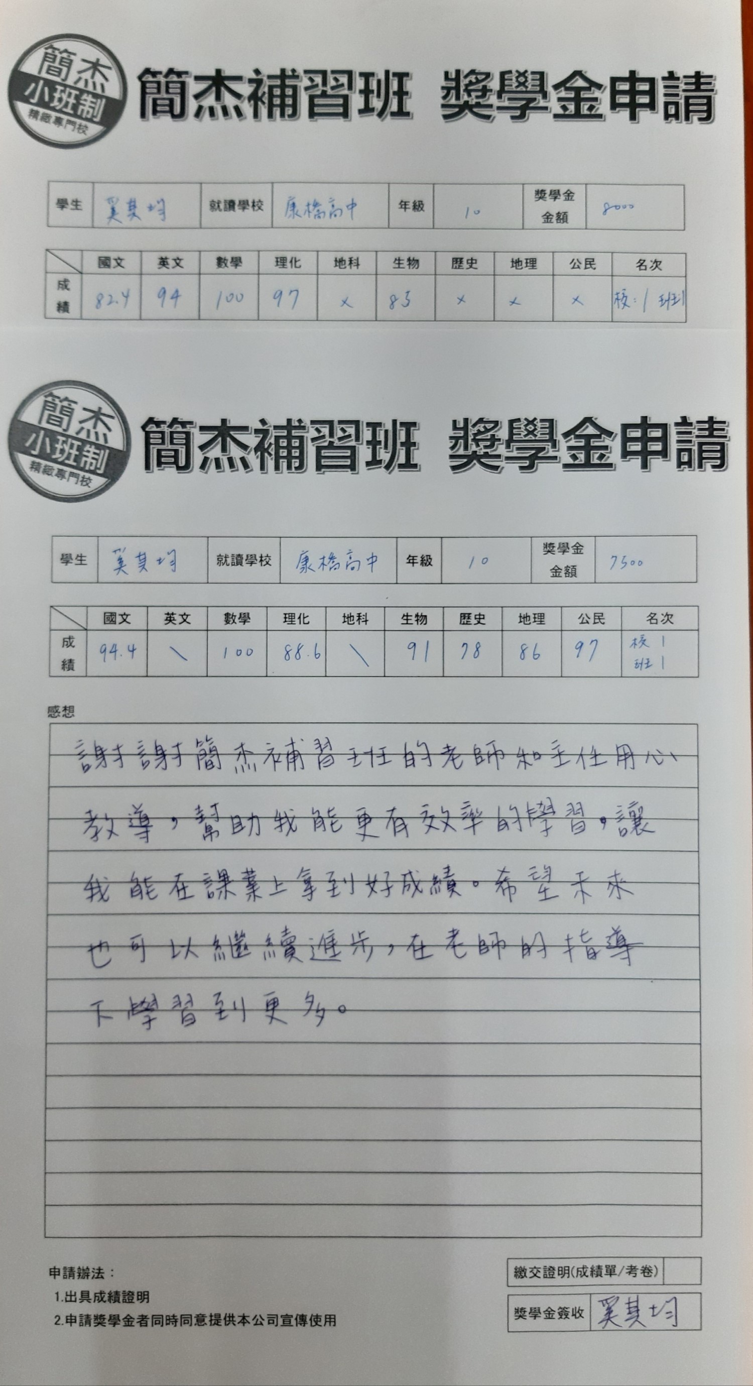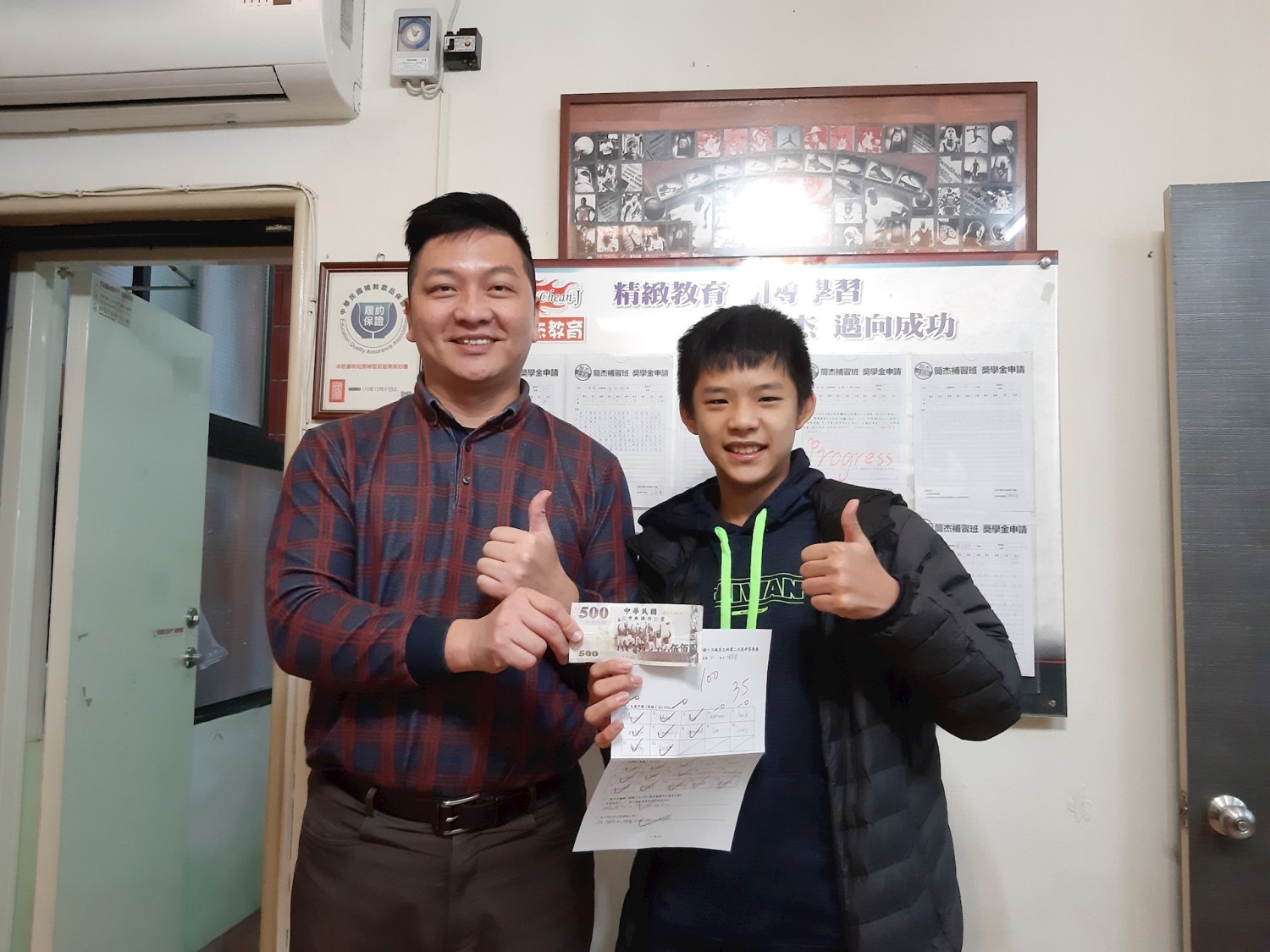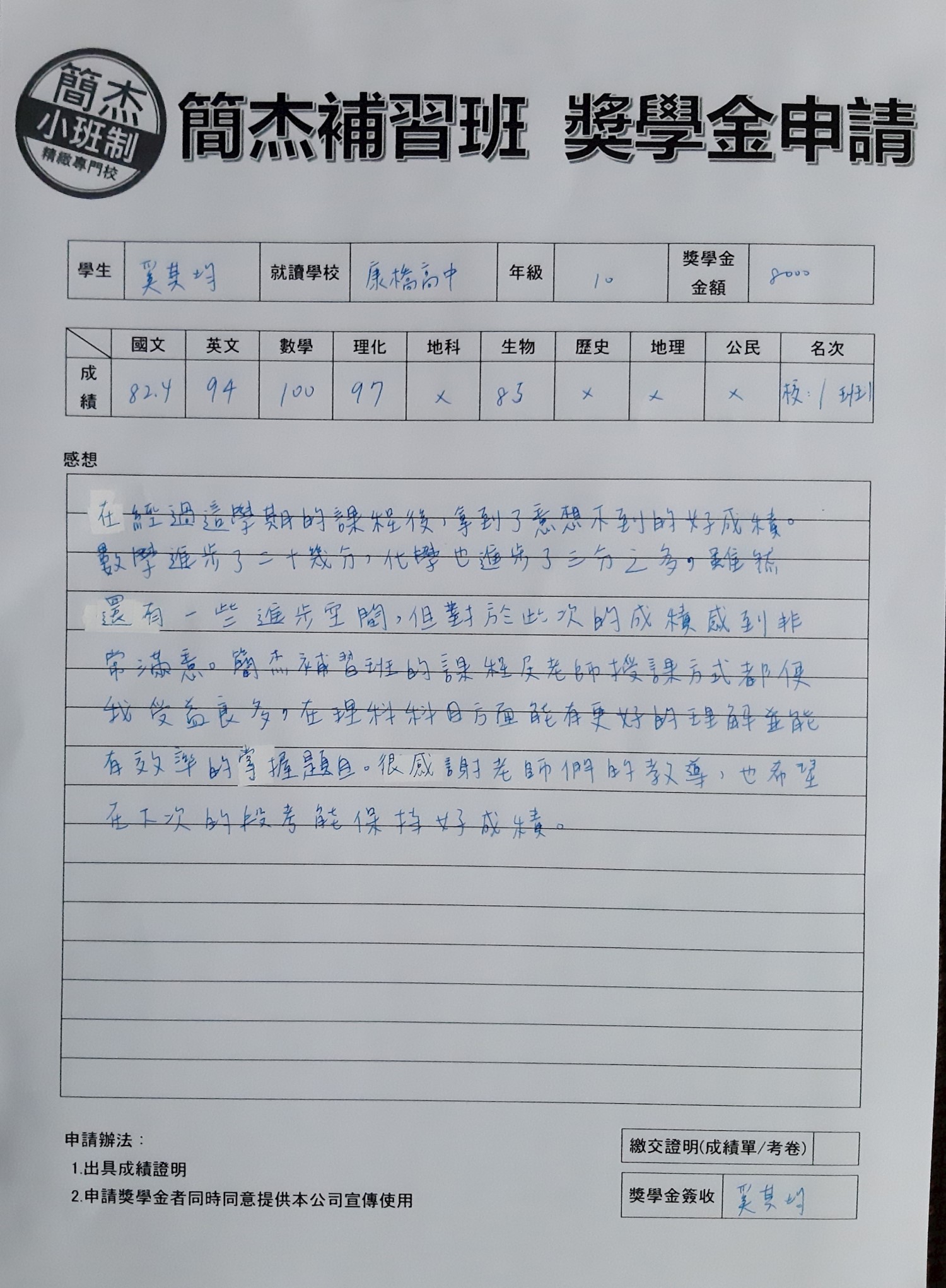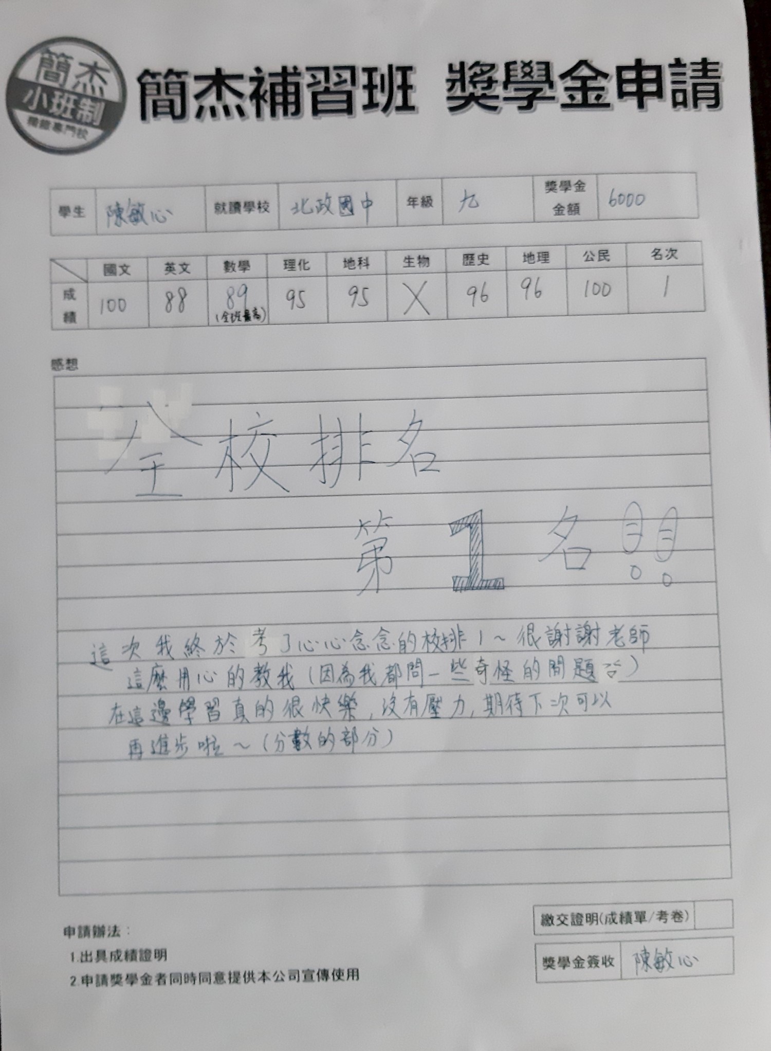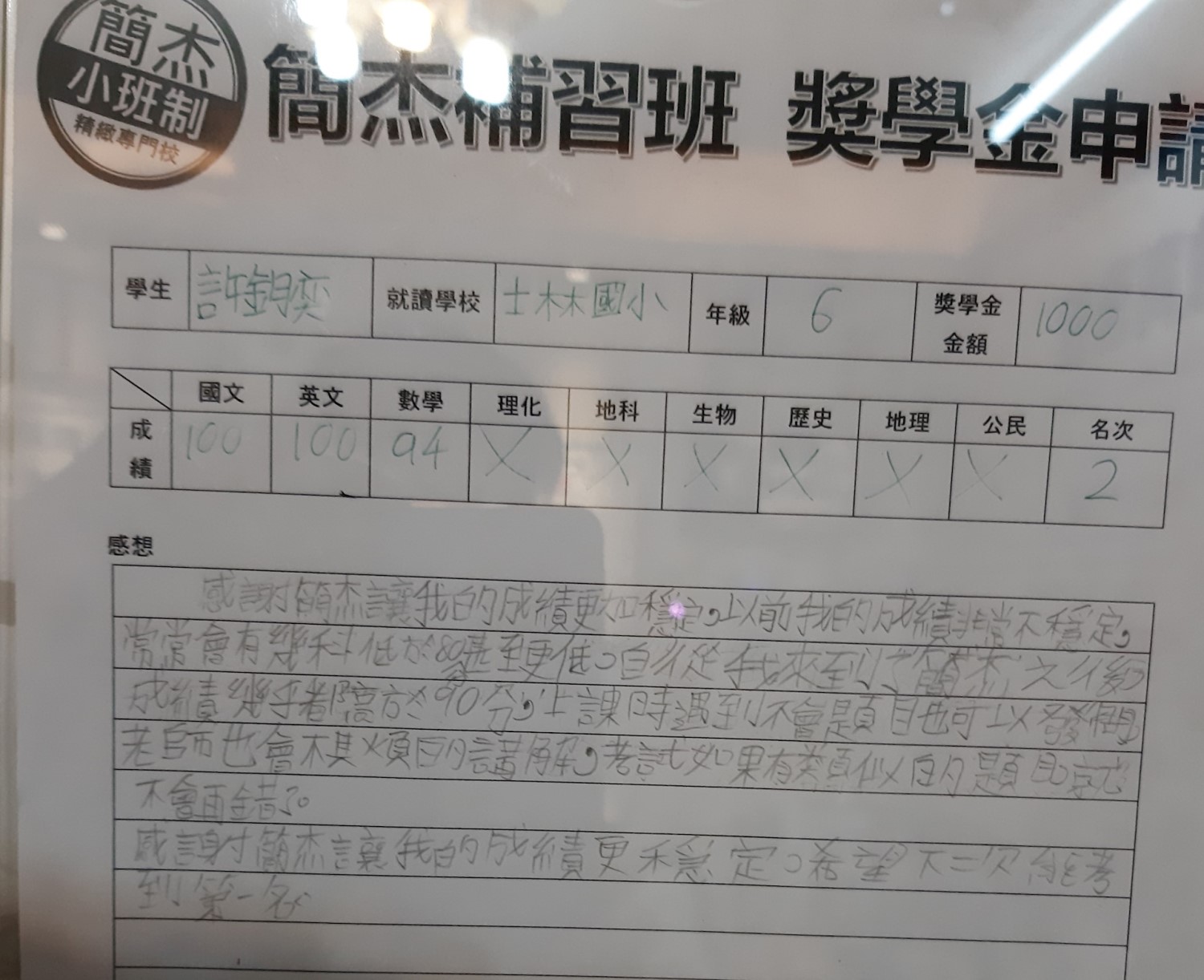 國小英文段考100分 國語100分 班排第二名 數學超過90分 簡杰補習進步很多順利考取薇閣國中