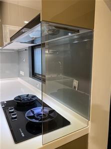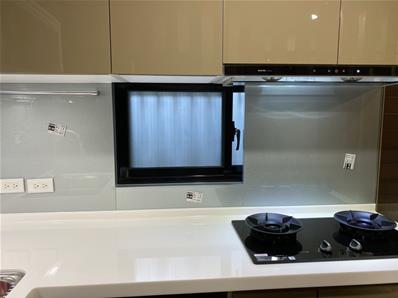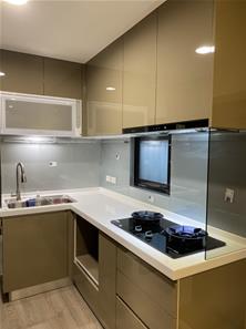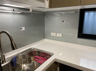 伸縮不鏽鋼龍頭、KL-101海灣造型單槽、緩衝拉藍、緩衝鋁抽、緩衝側拉調味組、5mm烤漆強化玻璃
