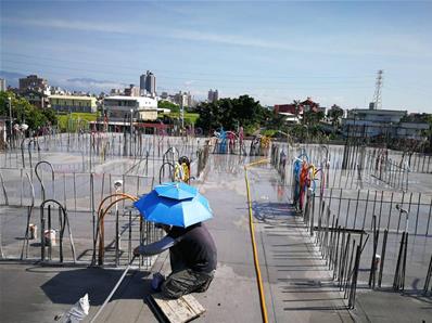 頂著35度的烈日下,為了不讓混凝土表面龜裂,工作人員們拉好水管、澆濕模板,再搭配高壓沖洗器的噴霧效果養護,最後當然還有不能馬虎的粉光拉毛作業!