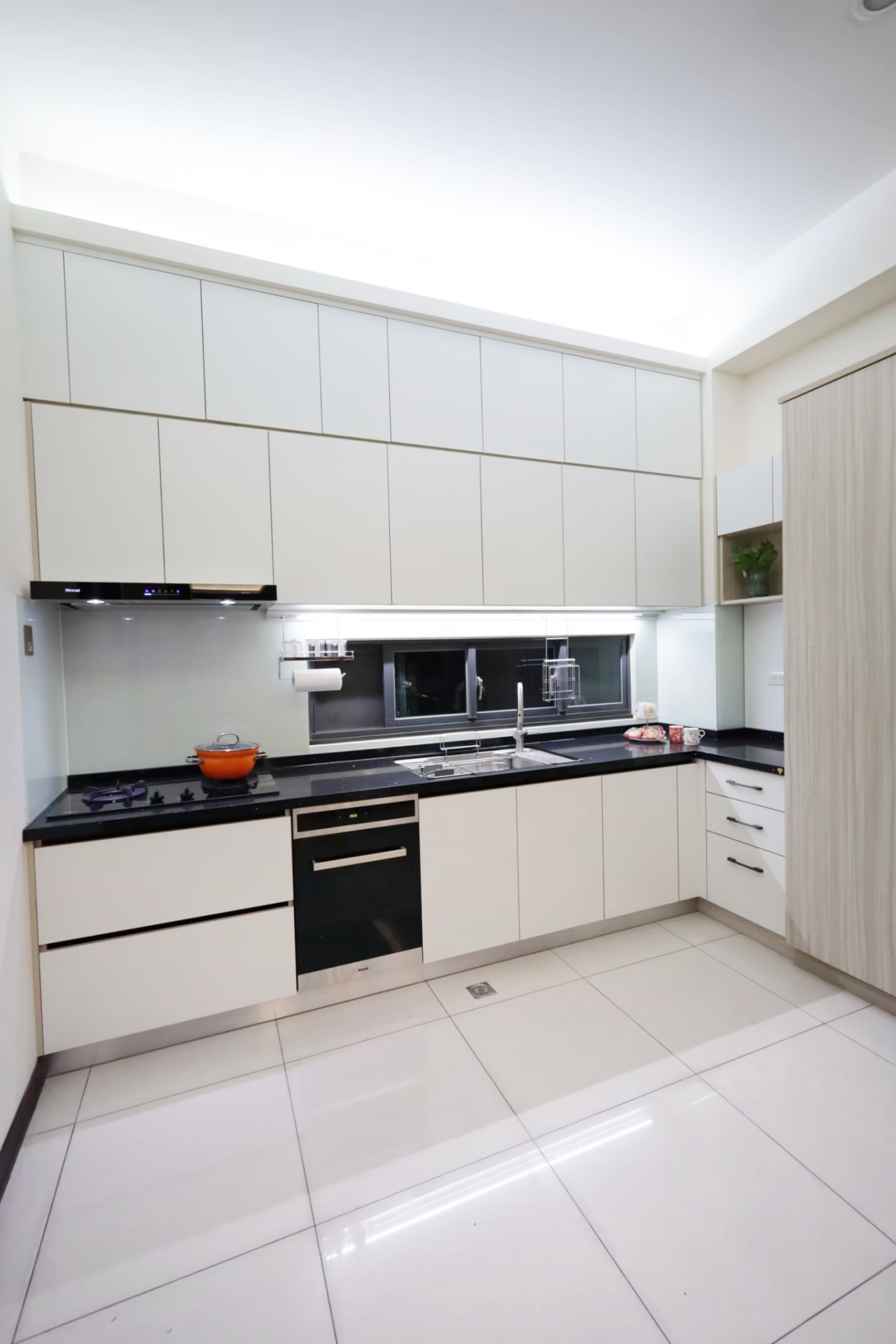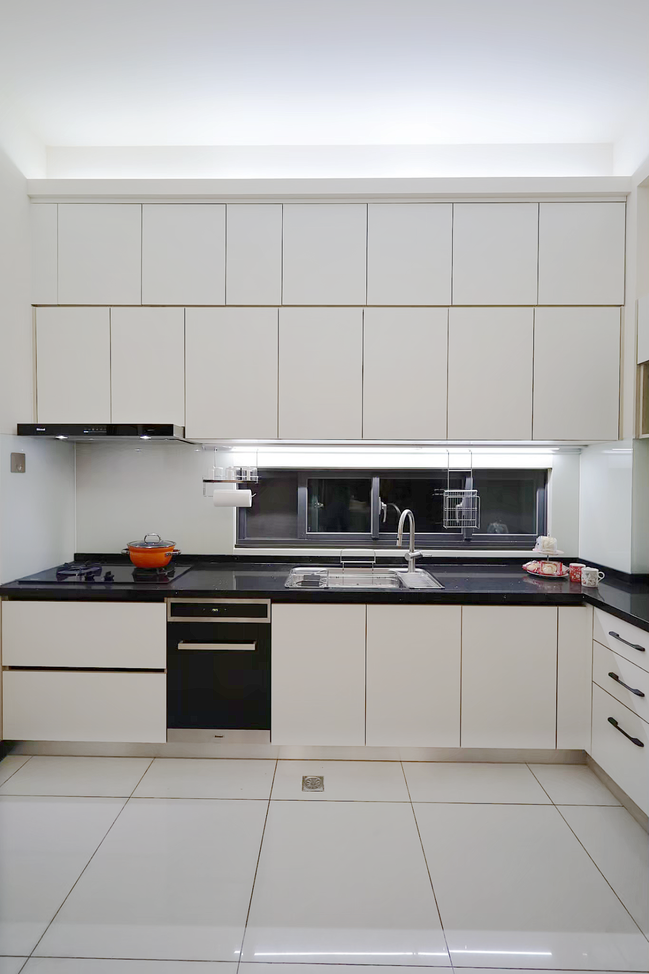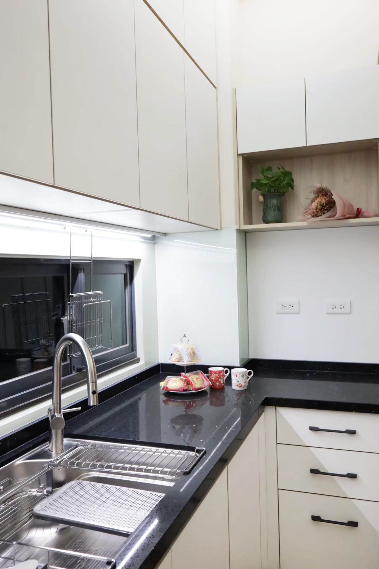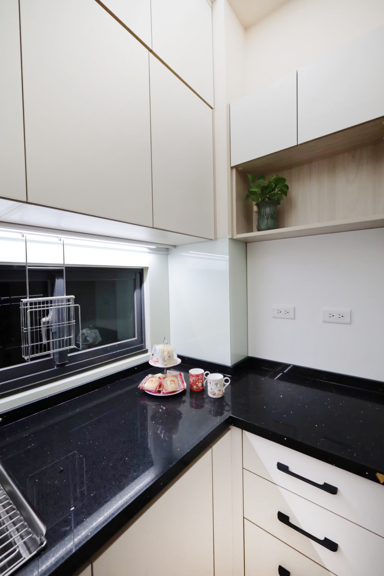 與牆面同色系的廚櫃,加上乾淨俐落的線條