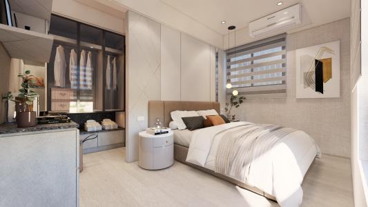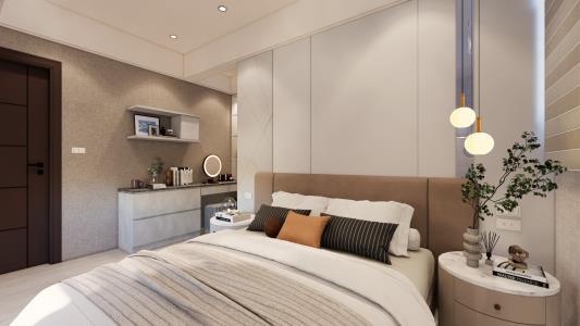 主臥室延續了整體風格,展現出沉穩而雅致的氣質。擴展的床頭牆面巧妙地劃分了更衣區,既增強了實用功能,在靜謐溫馨的氛圍中充滿舒適與放鬆。