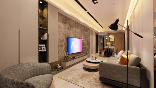 我們以現代沉穩風格為設計核心,實現了簡約與輕奢的完美融合。電視牆面採用石材紋理比例分隔設計與展示櫃和沙發背牆的隔柵線條、茶鏡相互映襯,為空間注入了精緻輕奢質感,彰顯出無與倫比的品味。
