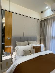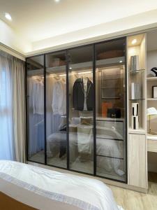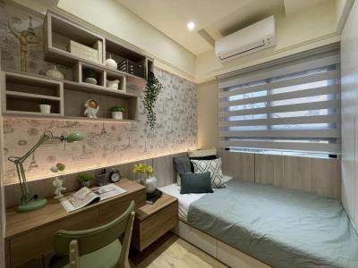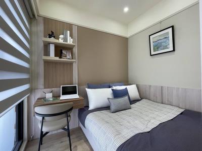 主臥室運用格柵與黑鏡複合材質,連貫比例與層次,呈現出夢幻般的低調奢華風格。孩子房設有功能性的書桌和收納組合,床榻下方配有儲物拉抽,充分發揮空間效能。