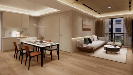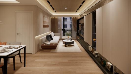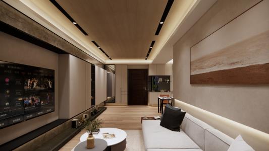 整個空間以簡約內斂錯落有致地鋪敘,呈現出極致的沈穩基調,電視牆的細緻石材紋理和特殊塗料技法,以鐵件展現出俐落的線條,反襯天花及木地板的溫潤謙和形成和諧對比,創造視覺多層次變化,使視野更顯通透,燈光巧妙點綴為空間增添獨特的沉浸式氛圍,讓人不由自主地沉醉其中。