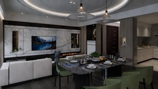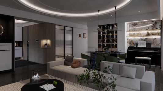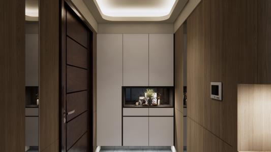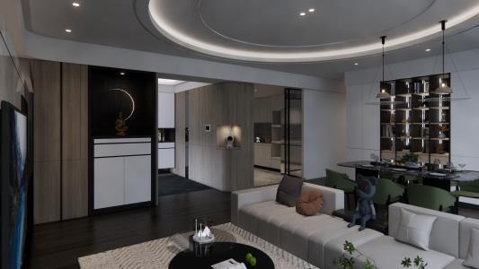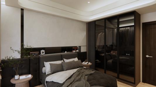 玄關每一處空間都經過精心打造,注入質感輕奢設計因子,營造出歸心靜謐的氛圍。轉角處檯面設計以燈光為襯托,達到緩衝效果。公領域空間以開放性和通透明亮為主,透過合理的布局開闊視野。石紋電視主牆揉合木質襯托氣度,呈現優雅內斂輕奢感,並將神明桌巧妙地融入客餐廳場域,打破了空間的限制。天花的設計以舞動圓弧為主題,勾勒出圓融的意象。在餐廳區,層架的規劃以線性燈光,呈現出明暗層次,同時融入了鋼琴,營造溫馨團聚的氛圍。廚房規劃玻璃拉門引入光線,並隔絕油煙。私領域的設計更加注重舒適和放鬆,主臥室以幾何線條及黑玻相間,展現了高雅沉穩的風華,女兒房則充滿了溫柔的調性,男孩房則展現了客製化美學的極致。