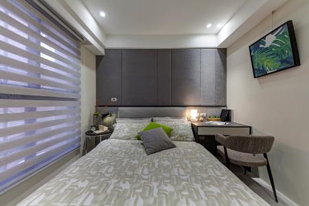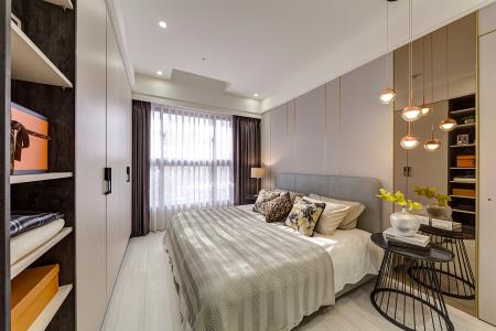 主、次臥室個別依據使用者喜好,在簡斂現代前提下,個別烘托絲絨、壁布、健康塗料等素材質感,主臥專屬灰玻衣櫃設置,尤其流露迷人精品旅店氛圍。