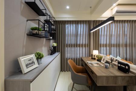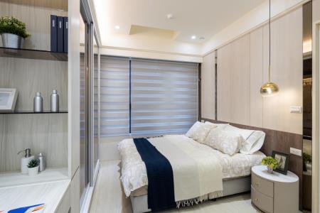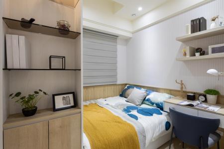 一房釋出為開放閱讀區,讓客廳視感開闊,固定半牆兩區分野,管線配電,特製金屬吊架,幾何裝置與實用。主臥室配色典雅,梳妝區機能連玻璃衣櫃,顯飯店質感。孩房精算比例,寢臥、閱讀、收納、展示同步,床榻下方儲物拉抽,坪效發揮酣暢淋漓。