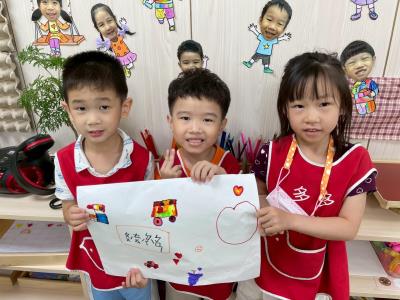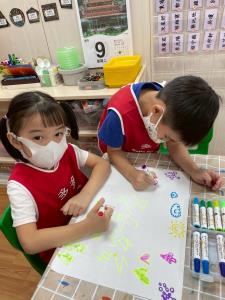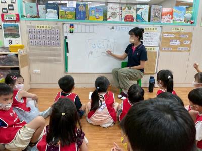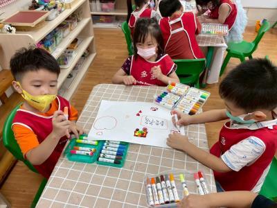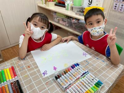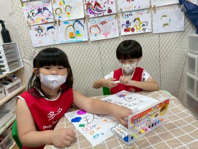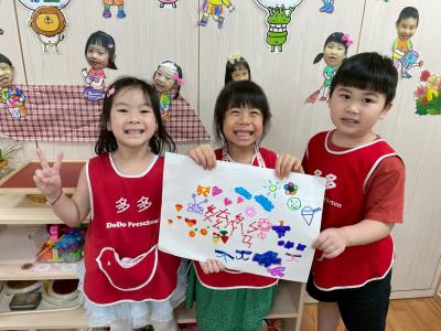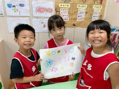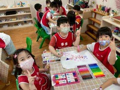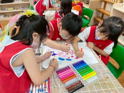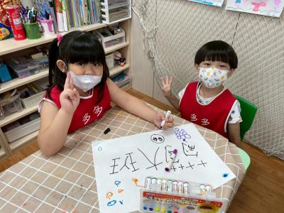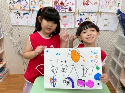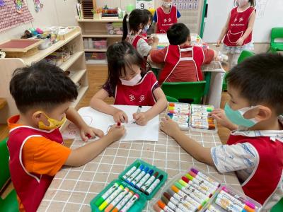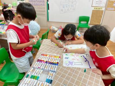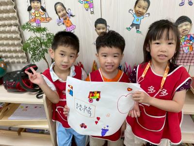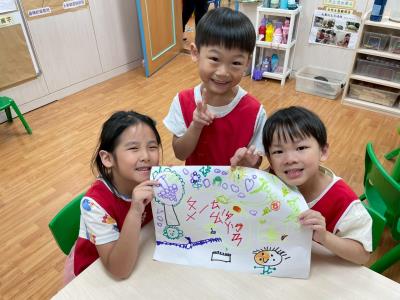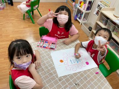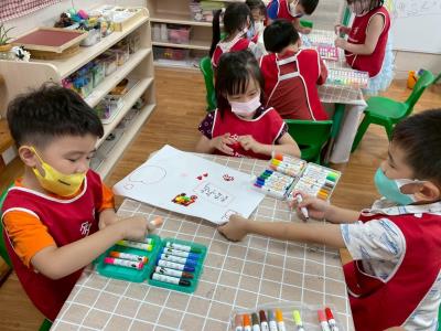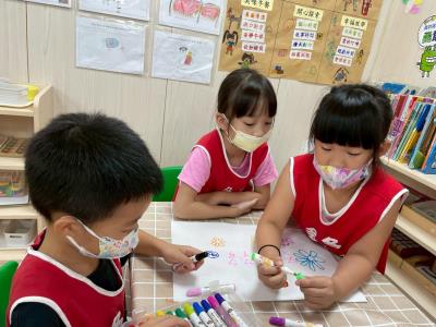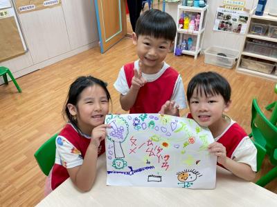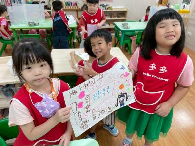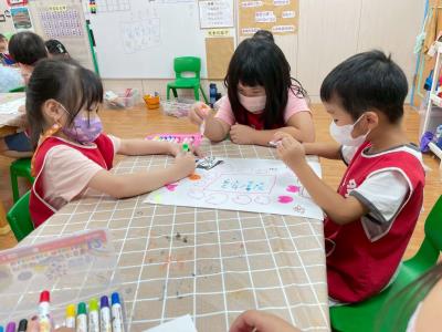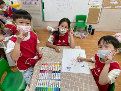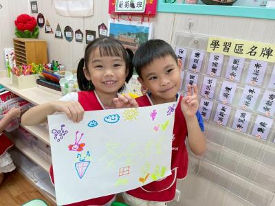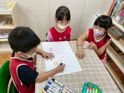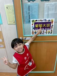 114.9.9【葡萄班牌】:接著分組設計班牌,孩子們發揮創意,在作品中加入葡萄、笑臉、太陽、愛心…等元素,並分享各自的象徵意義。最後老師將不同小組的點子統整,完成一面「葡萄大班班牌」,讓孩子在創作與分享的過程中,培養班級歸屬感,也更懂得合作與友愛的可貴。