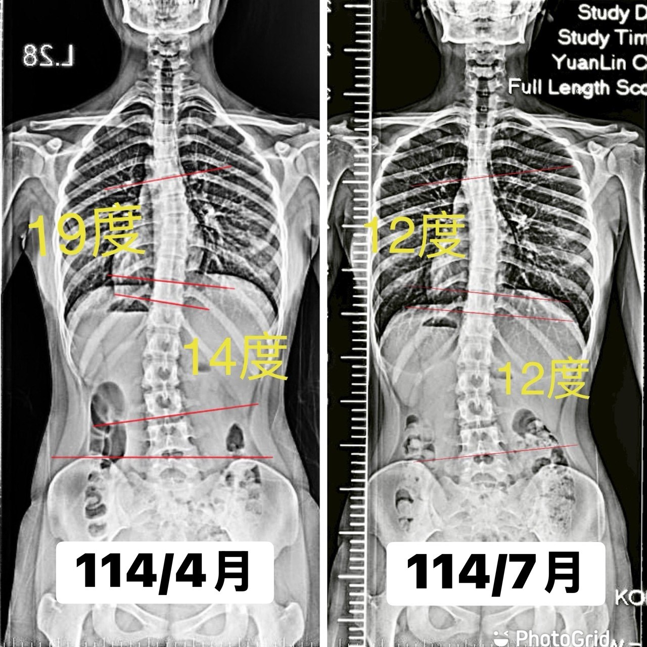 個案小瑜(化名),是一位認真配合訓練的高中生。原本有 #S型側彎,胸椎 19 度、腰椎 14 度。透過規律的一對一矯正課程與日常落實,經過短短3個月,角度進步到 胸椎 12 度、腰椎 12 度
