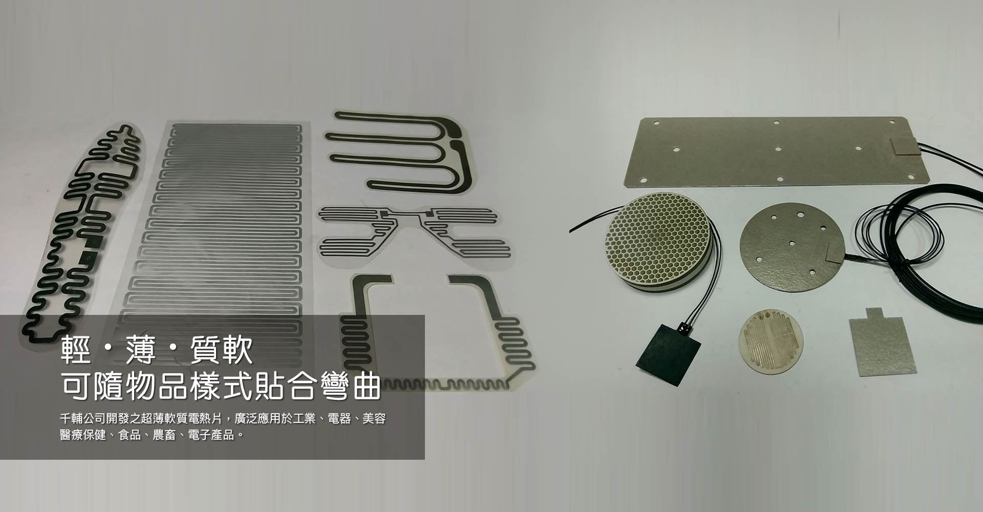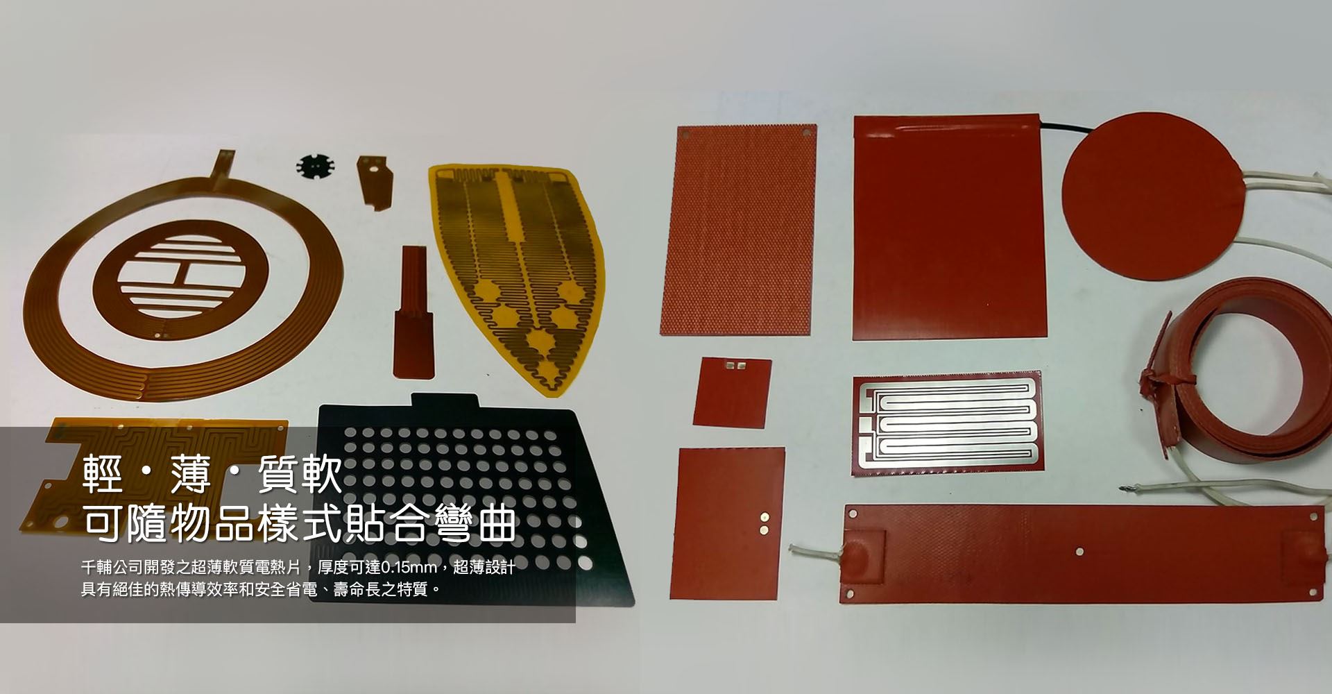 在科技產業快速發展的今日,超薄軟質電熱片,因其輕、薄、質軟、可隨物品樣式貼合彎曲的特性,而被大量引用。千輔公司開發之超薄軟質電熱片,厚度可達0.15mm. 超薄設計具有絕佳的熱傳導效率和安全省電、壽命長之特質,廣泛應用於工業、電器、美容、醫療保健、食品、農畜、電子產品。