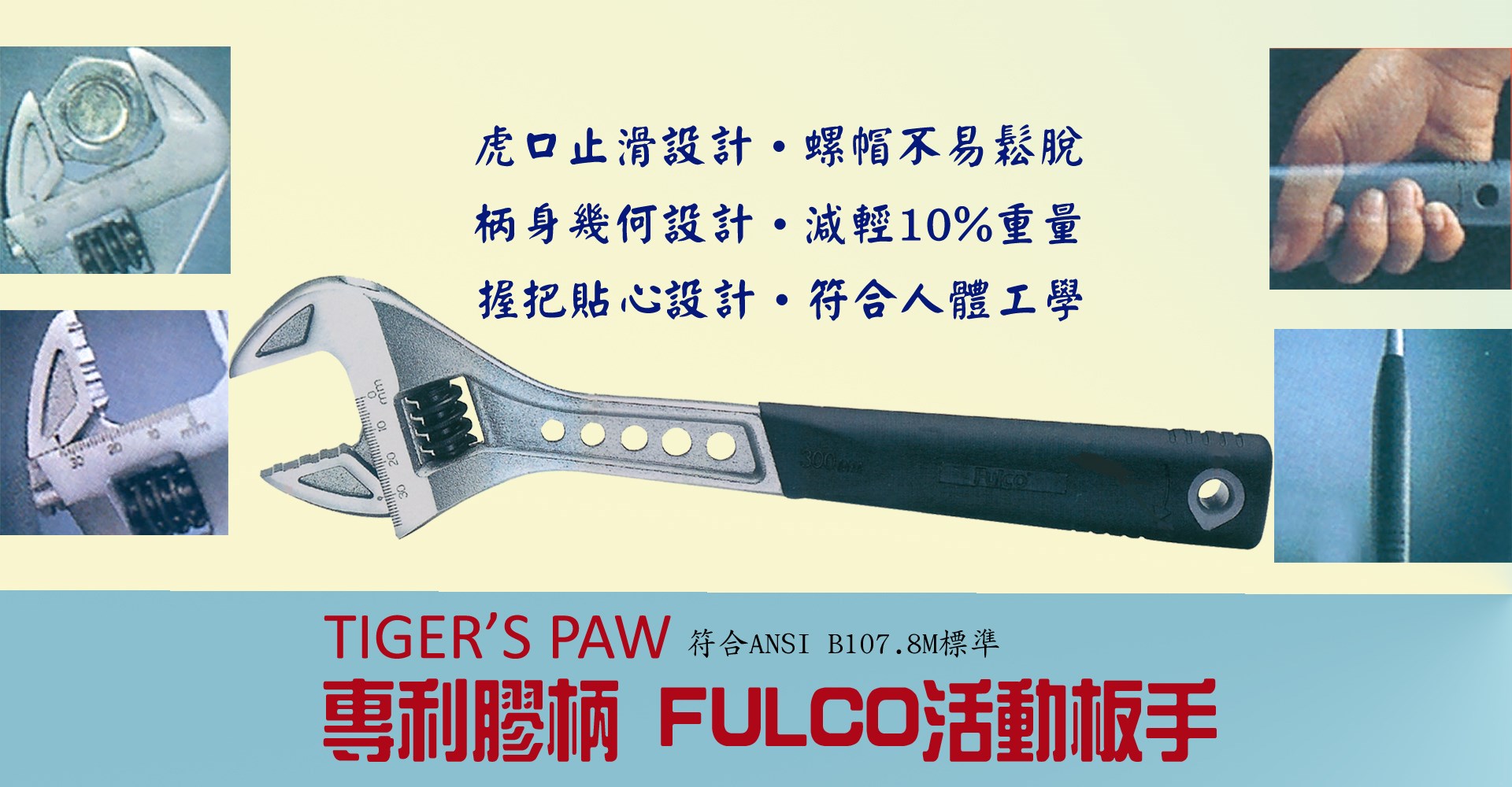FULCO專利膠柄活動板手 開口止滑設計防止螺帽鬆脫 柄身重量減輕10% 握把符合人體工學