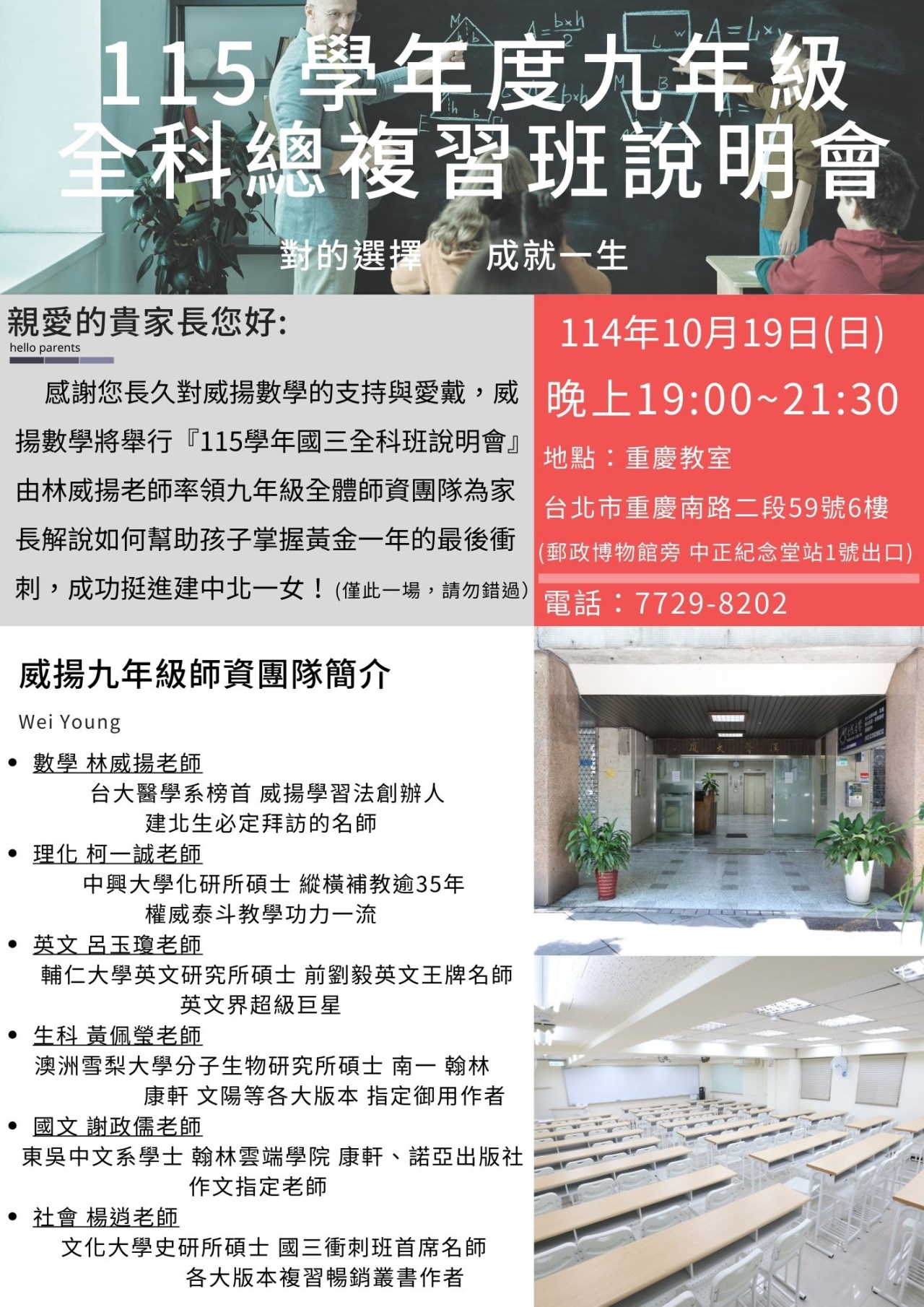 114.10.19(日)晚 7點 舉行115學年九年級全科班說明會 帶...