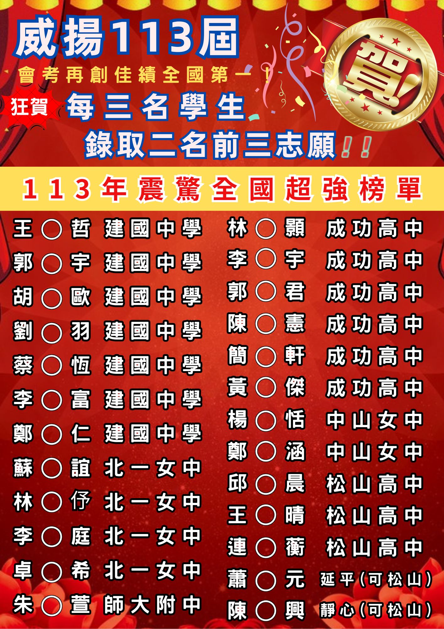 賀 ❗ 114年國中會考最新榜單出爐🥳🥳🥳 本班 5位同學5科滿級分 亮眼成績 !!! 👏👏👏 威揚全體師生同慶 !!! 全程參與國三全科衝刺班的同學,錄取建國中學3位(含1名改薇閣),北一女中 4位,師大附中 5位,成功高中 7位,中山女中 4位(含1名改大安高工),松山高中 1位 總計前三志願錄取人數24位, 前三志願錄取比率1/2以上!!! 以上恭喜各位優秀的學生們
