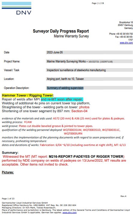 We service clients including WPD,Mammoet,Seaway(SOC,SHL),JDN,Boskalis,Vanoord in Anping and Taichung port.