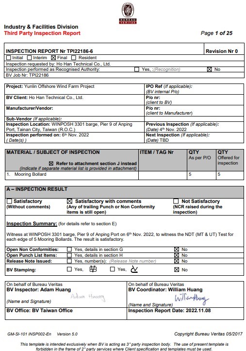 We have the honor and chance to join in off shore wind farm subject in Anping port from 2019 till now.