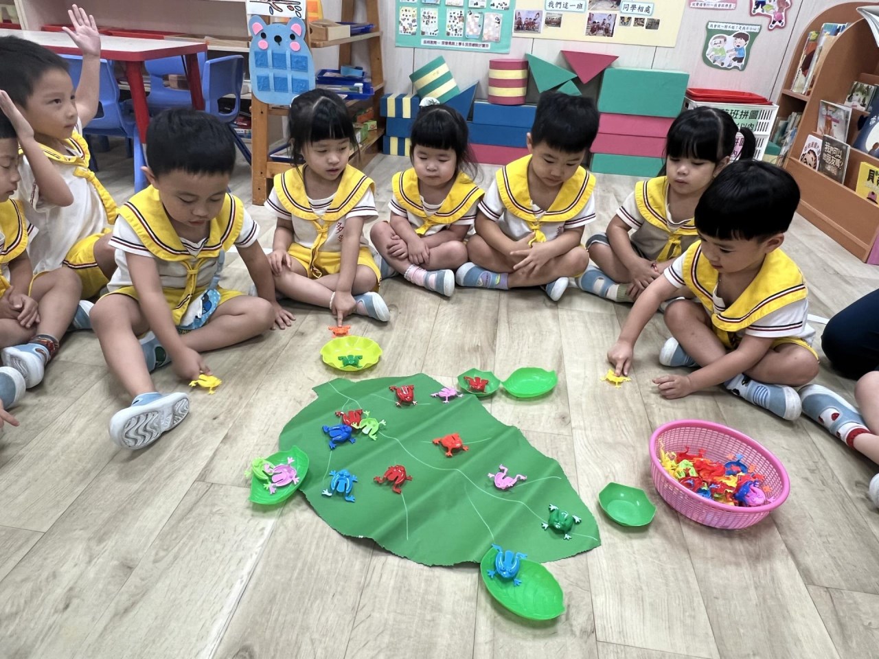 【114/10/16主題活動(一)我愛上學:找好朋友一起玩跳跳蛙】老師透過音樂遊戲,小青蛙找老婆,找到好朋友一起玩跳跳蛙,青蛙喜歡在大荷葉上休息,我們用食指按壓青蛙尾端的按片,看誰的跳跳蛙會跳進荷葉和池塘水裡?找好朋友一起比賽,體驗玩的過程樂趣還能數一數每個顏色青蛙有幾隻,我會寫數字記錄下來。