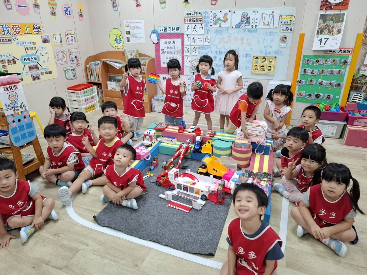 【114/10/17主題活動(一)我愛上學:玩具分享日】每個星期五孩子們都很期待可以帶玩具跟同學分享,你願意嗎?玩具小主人集合各式各樣玩具,介紹玩具名稱及玩法,並請同學說:「可以借你玩玩看」,透過一起分享玩具及輪流交換玩,孩子們分享能玩很多自己喜歡的玩具很好玩、超開心,孩子學會大方與別人分享及愛護玩具的美德。