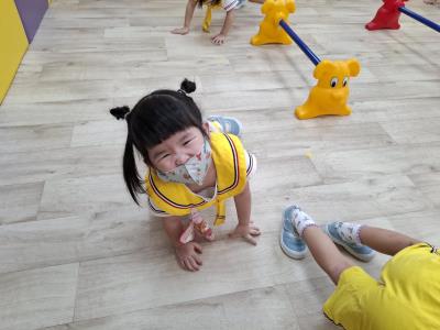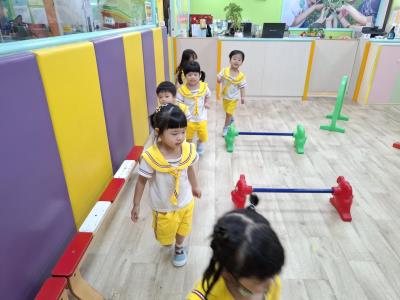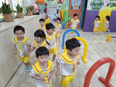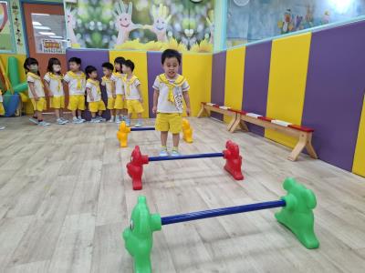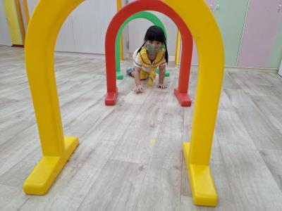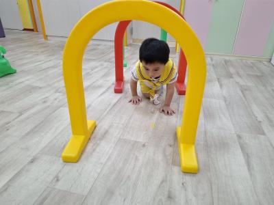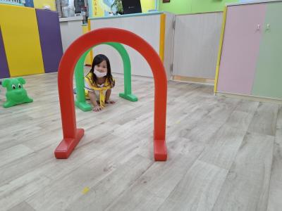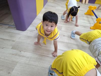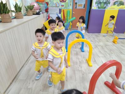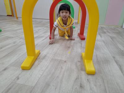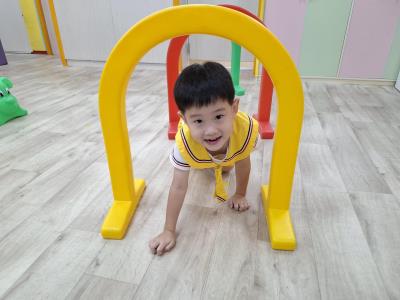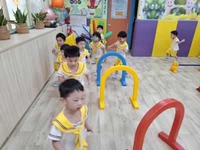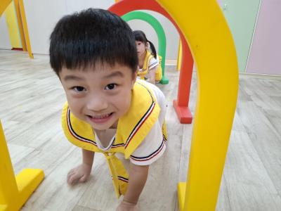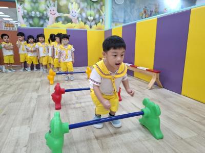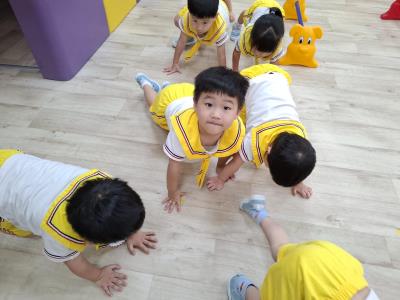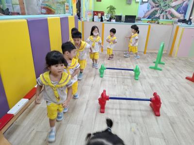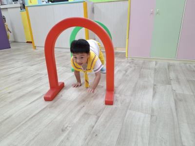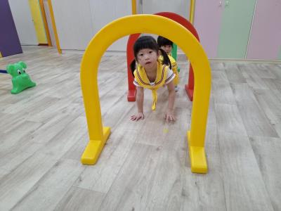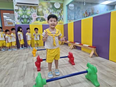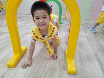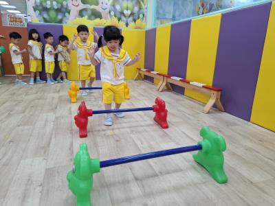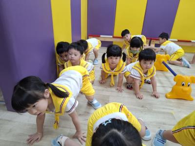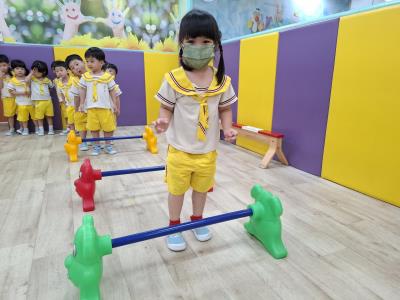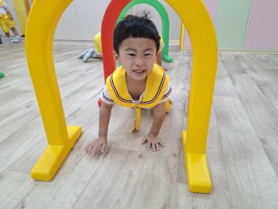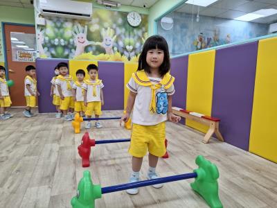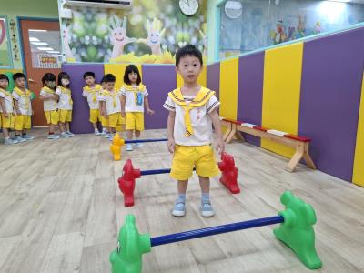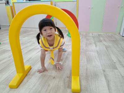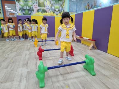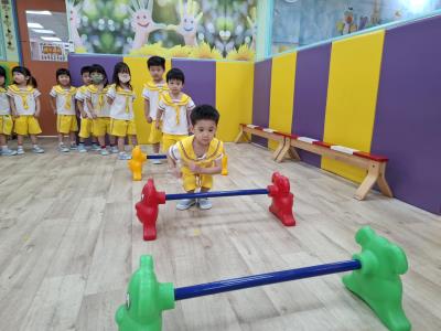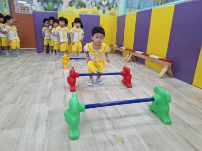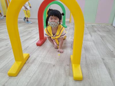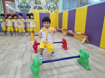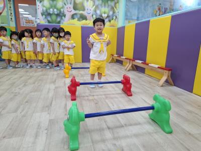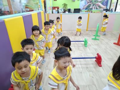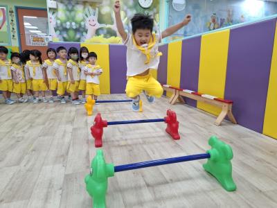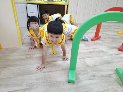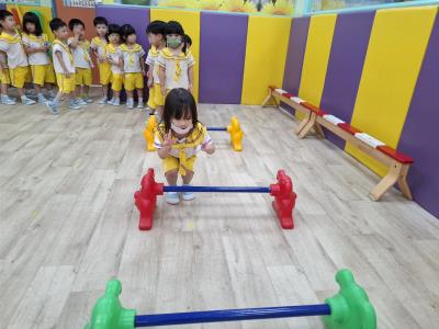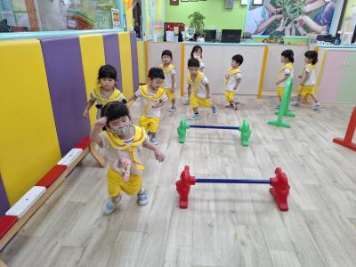 【114/09/08 每日實施30分鐘出汗性大肌肉活動:跳躍跨欄】 香蕉小兵雙腳跳躍連續穿越大約10公分柵欄,訓練孩子們膽量及腿部肌肉和爆發力,增加全身敏捷性,接著訓練能迅速移動身體穿過山洞的反應能力,天天運動身體好和專注力佳!