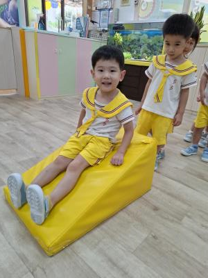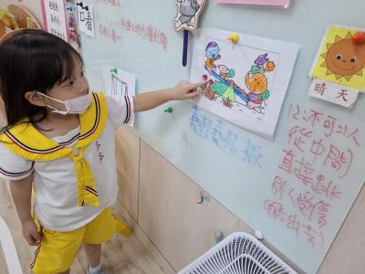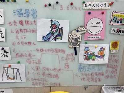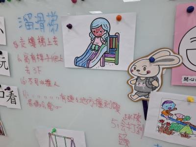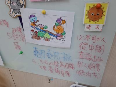 【114/09/08主題活動(一)快樂來上學:遊樂器材怎麼完才安全?】大家一起討論遊樂器材的正確玩法,盧盧老師說:「小朋友都知道遊樂器材的玩法和注意自身安全」老師與孩子們討論:公園的溜滑梯正確玩法? 牧鴻說:我有去有欄杆的梯子要手扶好爬上3樓在溜下來。 桐瑀說:不可以推人。 胡玥說:不可以推人會撞到硬硬的地方,頭會受傷媽咪會很傷心。 梓閎說:溜滑梯要坐好才能溜下來。 紘睿說:要排隊溜滑梯。 老師說:排隊爬樓梯要輪流坐好滑下來。