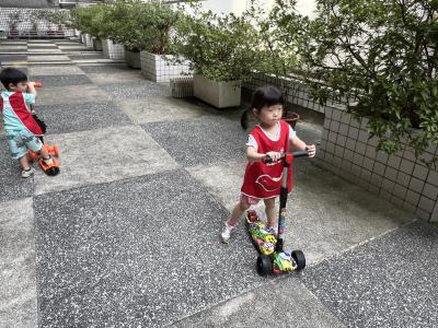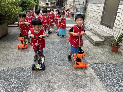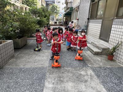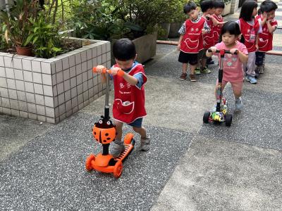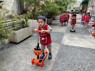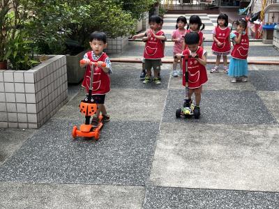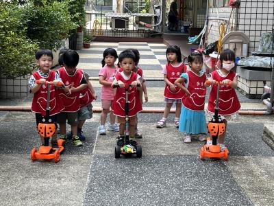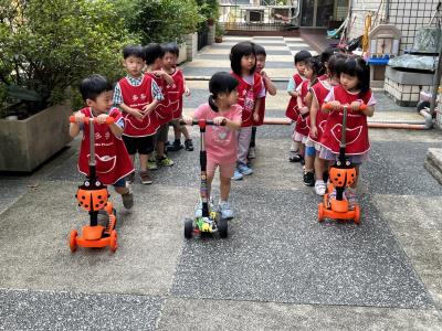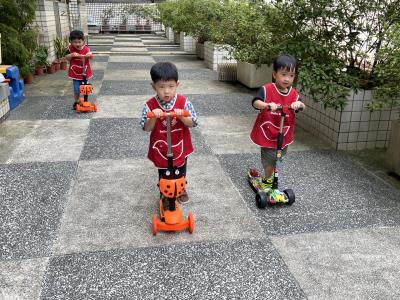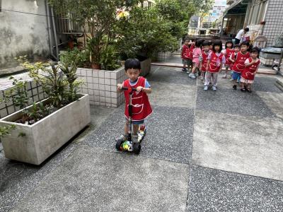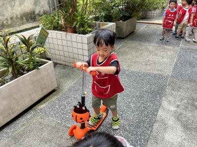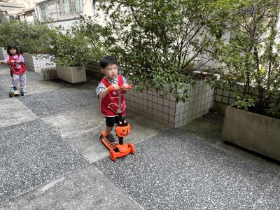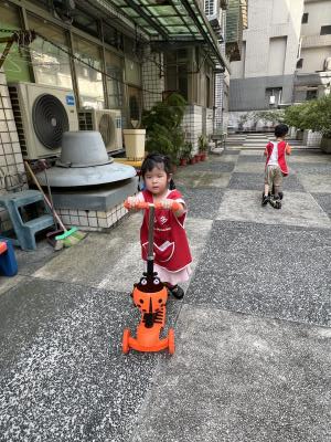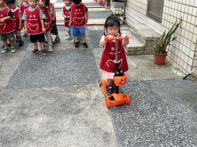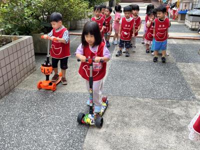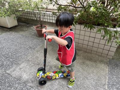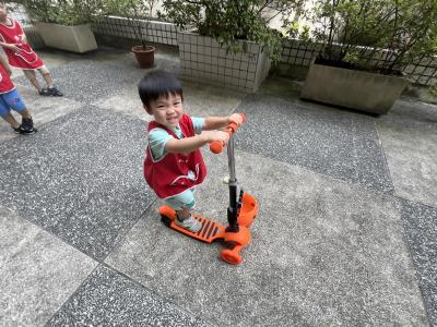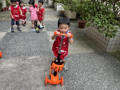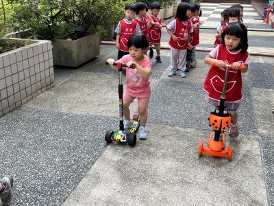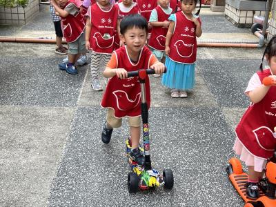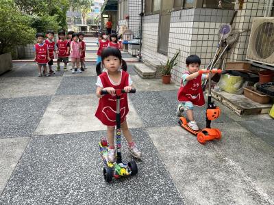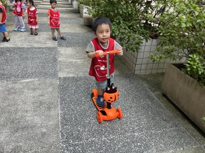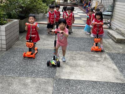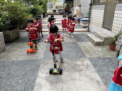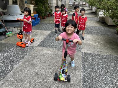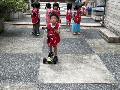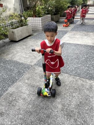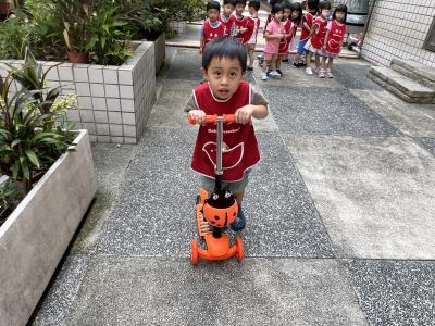 【114/09/09】★老師帶孩子們到戶外做暖身操活動及折返慢跑,慢跑過程能訓練孩子越來越靈活度和能控制安全距離,訓練全身平衡感及下肢肌耐力! ★謝謝梓閎媽咪借給滑板車,老師多提供讓孩子們戶外體驗騎滑板車,老師說明注意事項:1.要分組排隊輪流玩 2.不能騎太快要注意安全及避免碰撞。過程中有的孩子們感覺統合能力佳,騎起來全身協調性很靈活,滑步很順,有些孩子則手握龍頭會左右偏移和腳步跟不上來快跌倒…多提供練習機會待熟練後能夠滿足孩子平衡感和協調性,這可是很重要的全身發展里程碑喔!