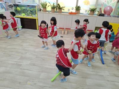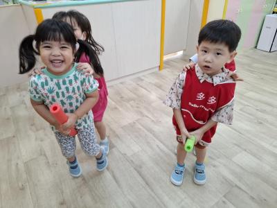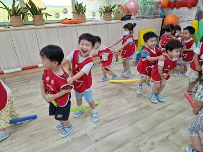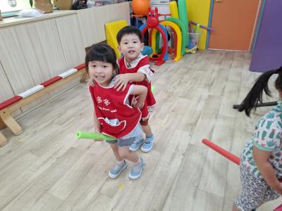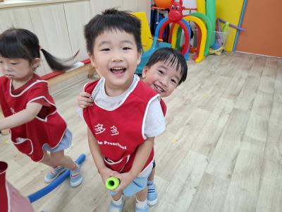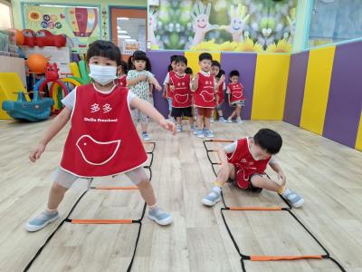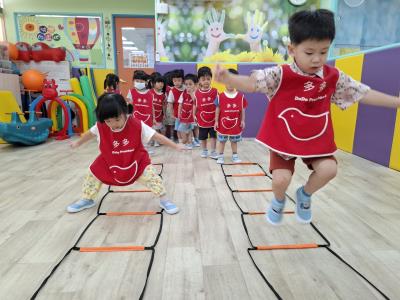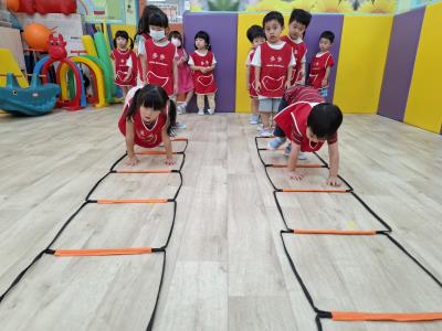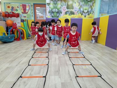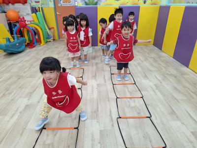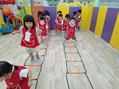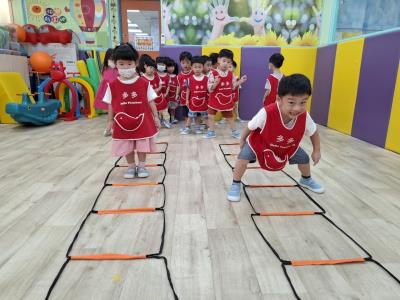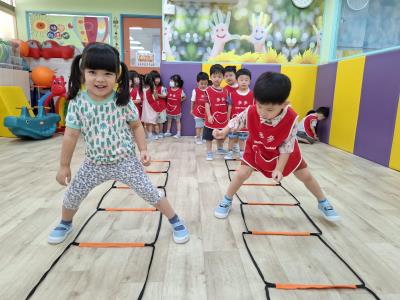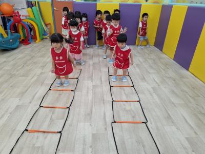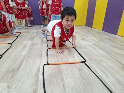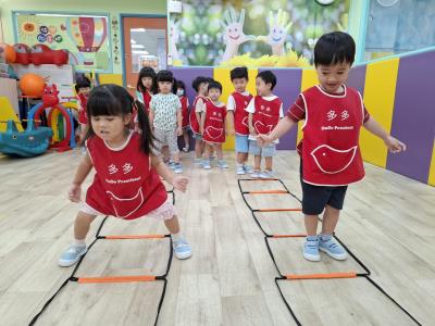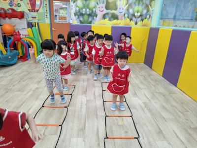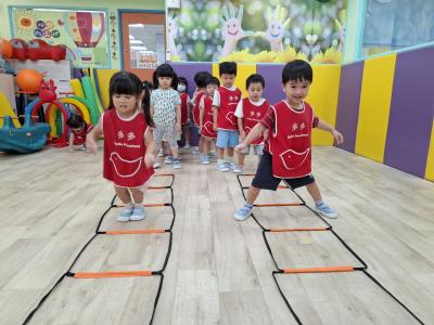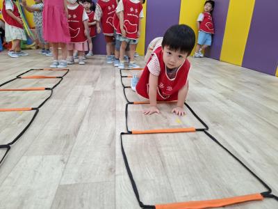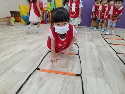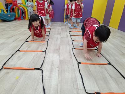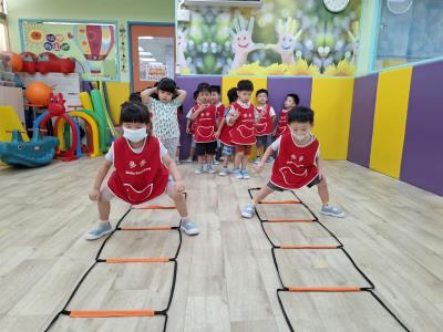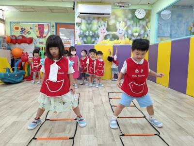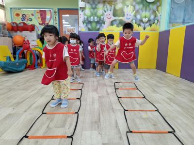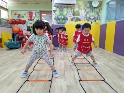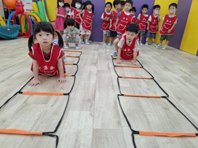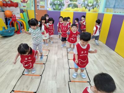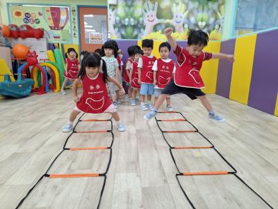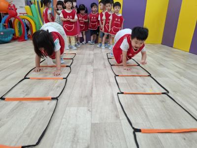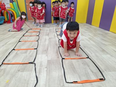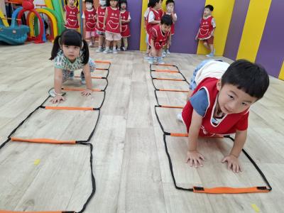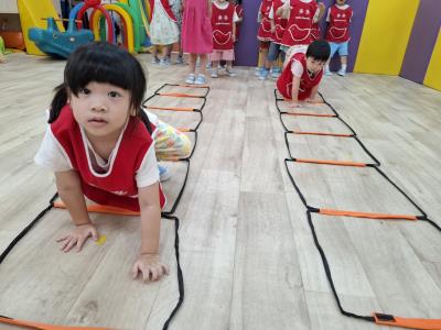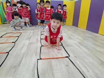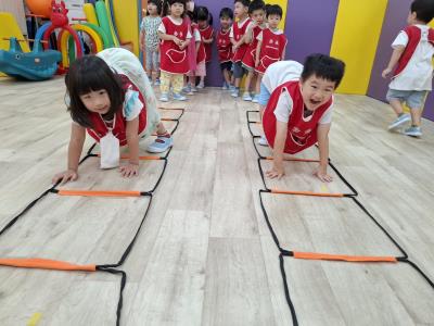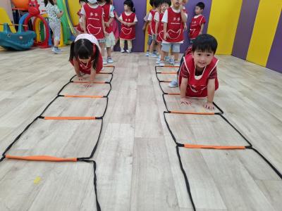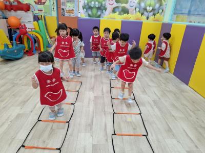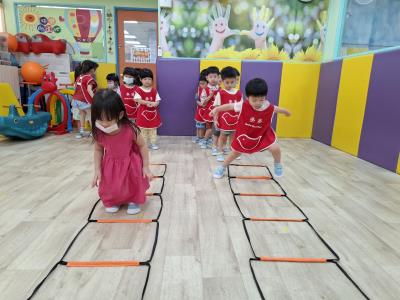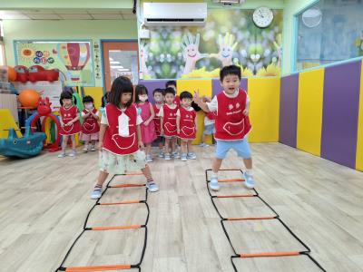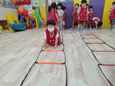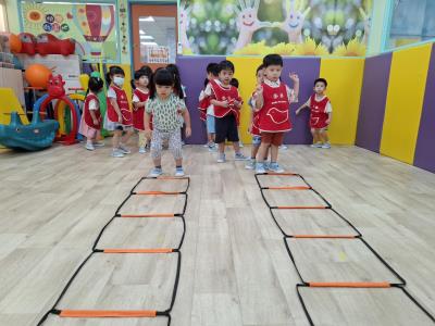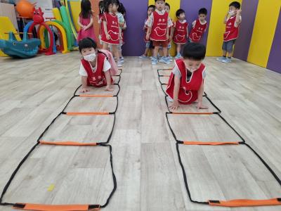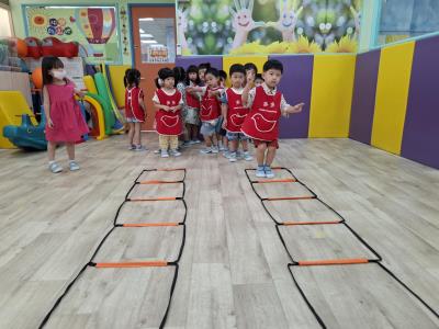 【114/09/10 每日實施出汗性大肌肉運動—繩梯&彩色太空棒】 看似簡單,今天香蕉小兵要玩什麼呢?需很專注跳過每一個格子配合腳步要開、合動作,看我們大展身手的模樣,投過遊戲提高孩子們專注力和兼顧身體協調及反應能力,練習2人一組玩騎馬打仗,練習下肢肌肉的爆發力和協調性,增加腿部的力量和速度,訓練體能大家自信滿滿好健康!