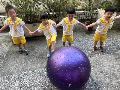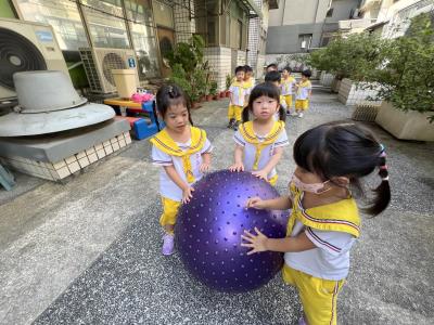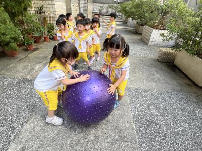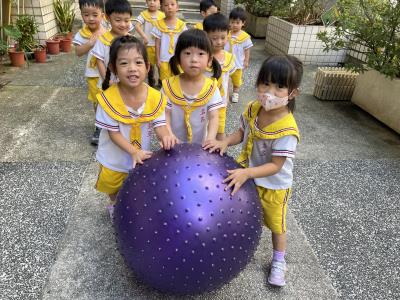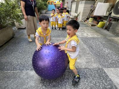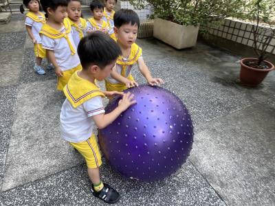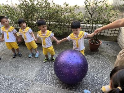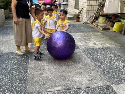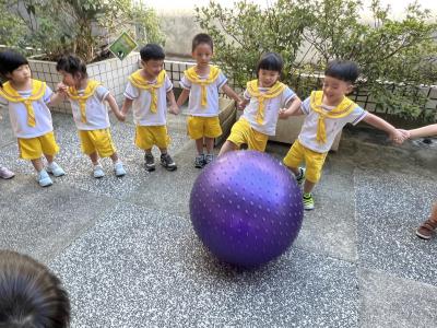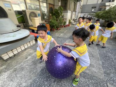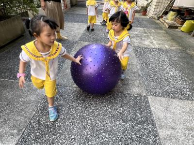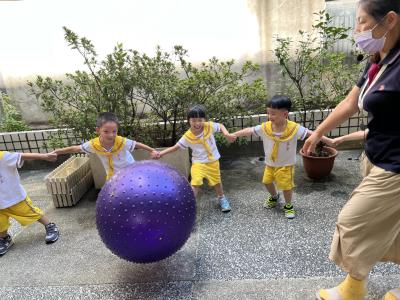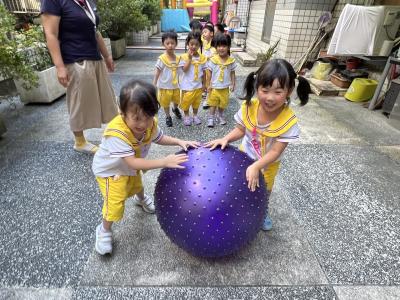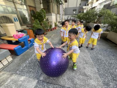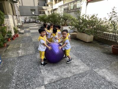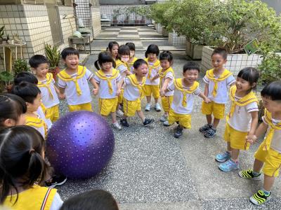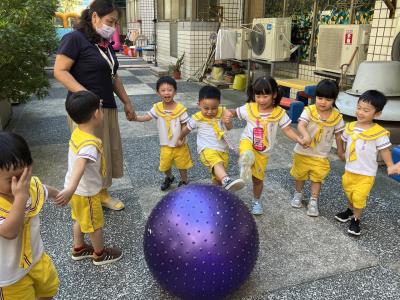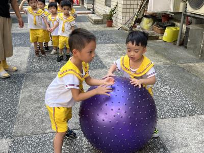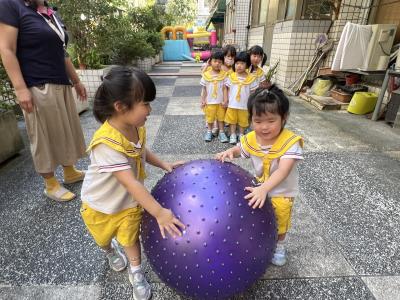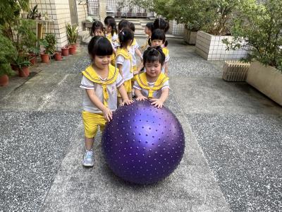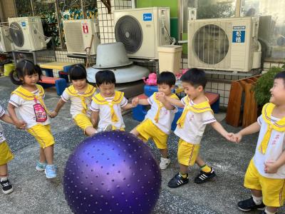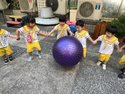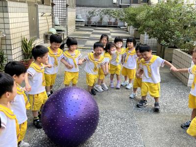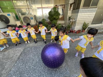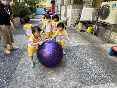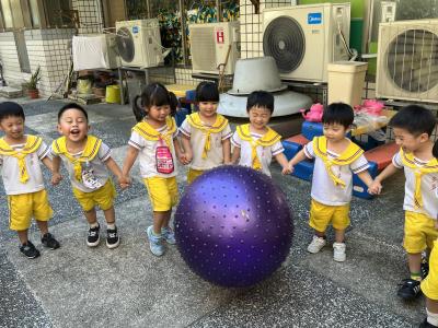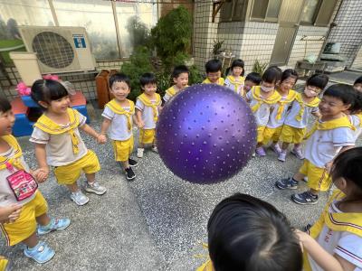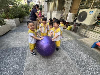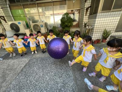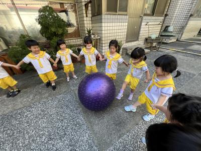 【114/09/15每日實施戶外大肌肉活動~~一起來玩大籠球吧】每天都好期待老師帶我們到花園跳律動和跑步及好朋友手牽手圍一個超級無敵大的圓圈,大家一起動動腳踢大龍球,孩子的笑容像花朵般燦爛、2人或3人搬運大龍球接力賽,大大的太陽跟著我們一起玩大龍球,陽光般心情動起來!運動後我會擦擦汗、洗洗手和喝喝水好健康!