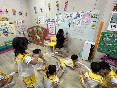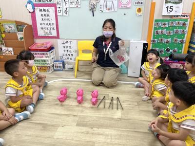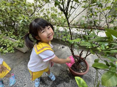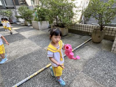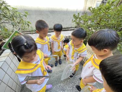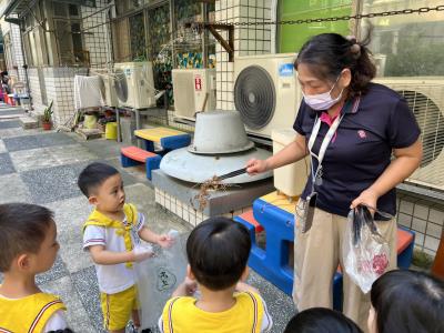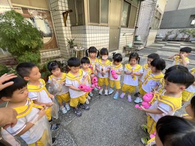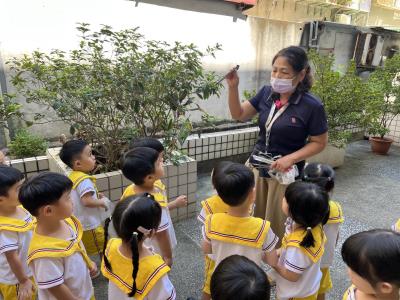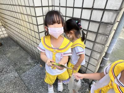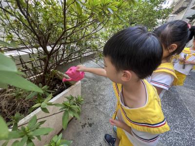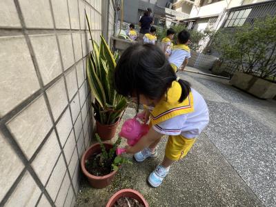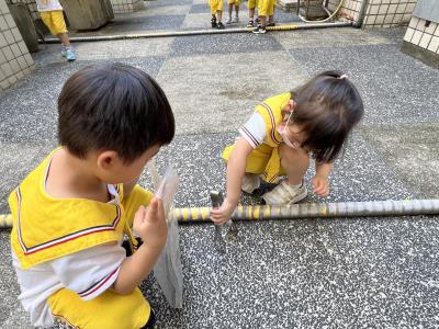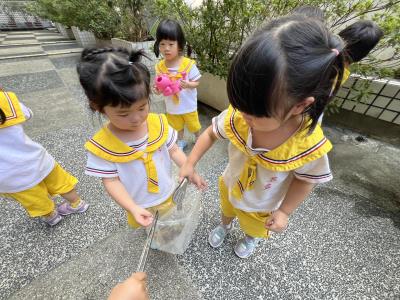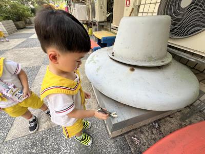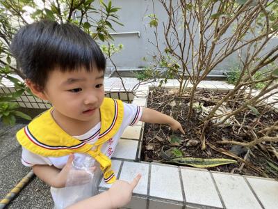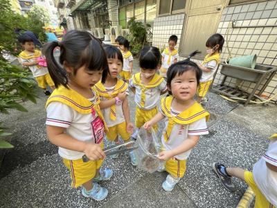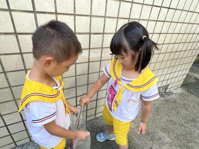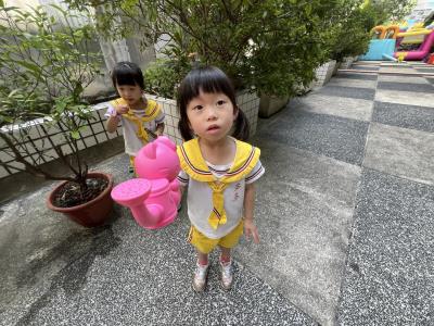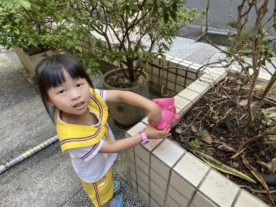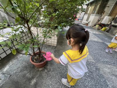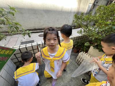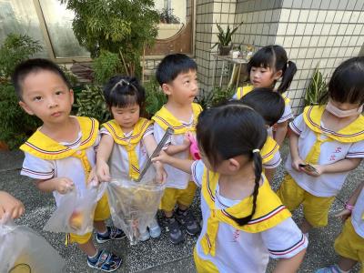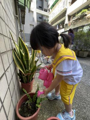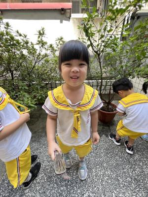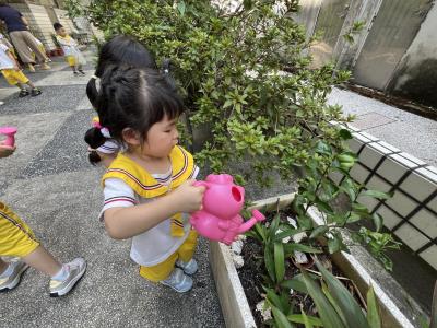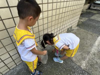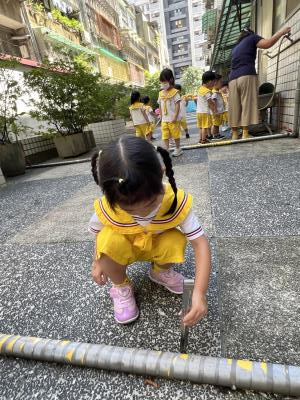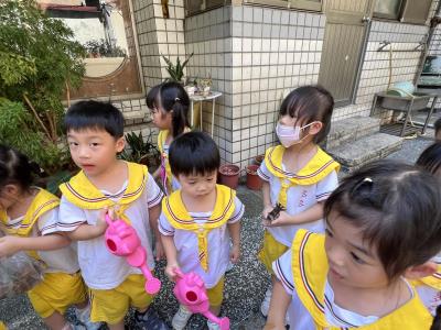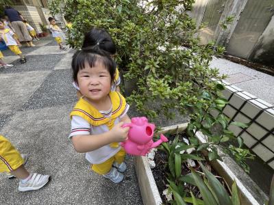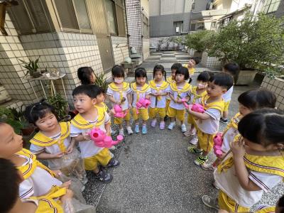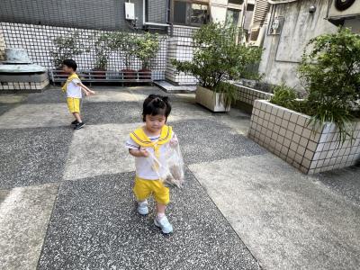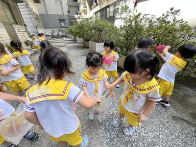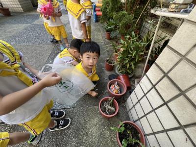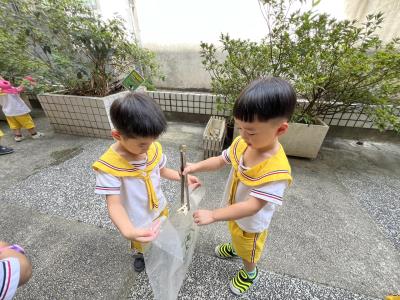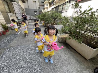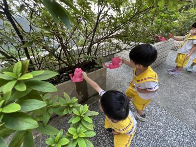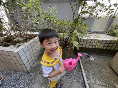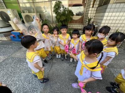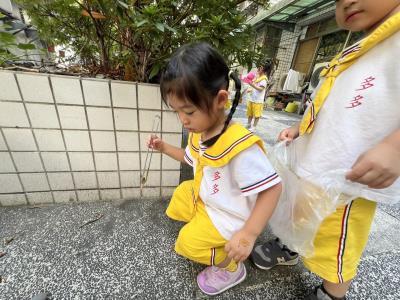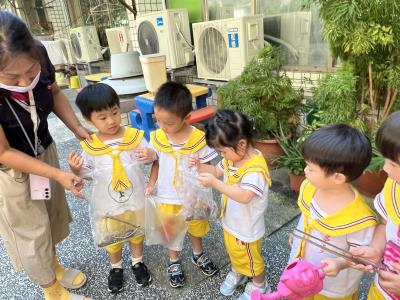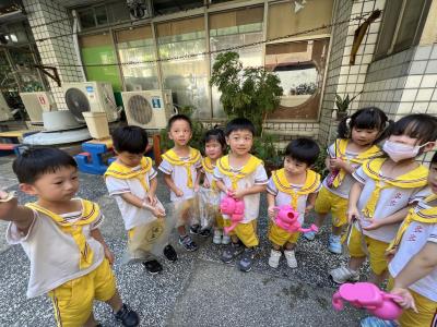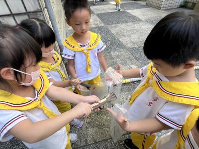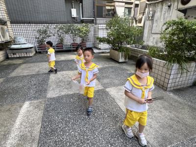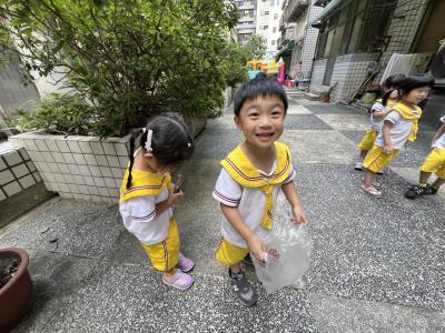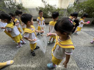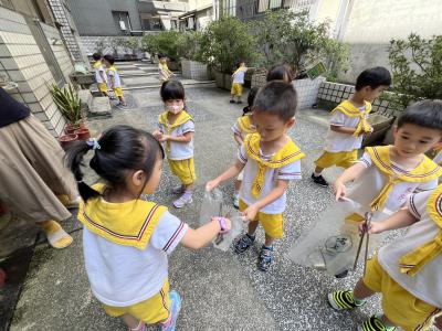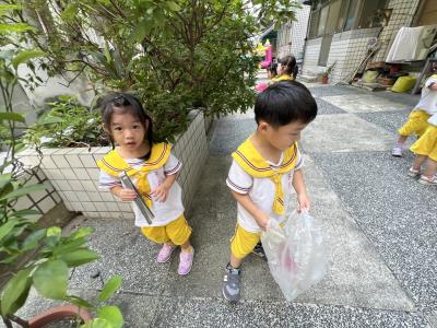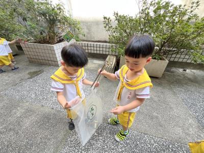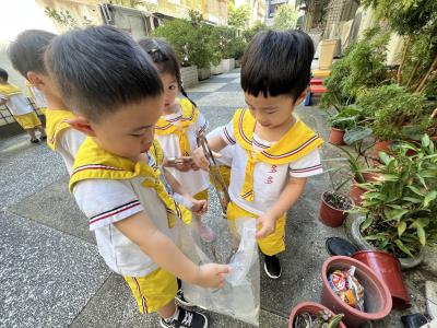 【114/09/15主題活動(一)我愛上學:我會愛護校園】 老師拿出大鐵夾、塑膠袋吸引孩子們好奇心,猜猜看我們要做什麼?老師說:『我們每天都去花園運動和玩耍,也要一起來維護清潔喔!』孩子們分組開始拿著鐵夾巡視花園撿落葉後裝進袋子裡和澆澆花讓花園變乾淨和照顧植物,大家開心完成自己的工作超級棒!