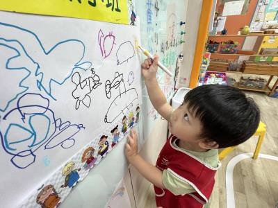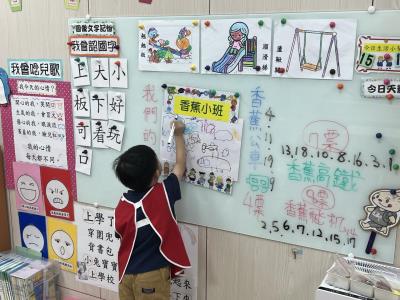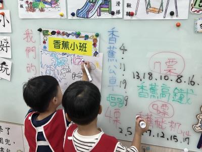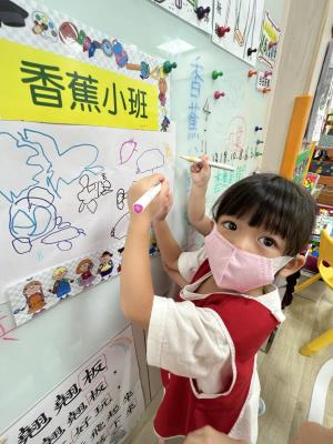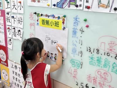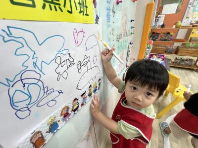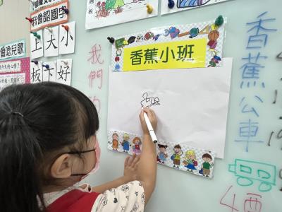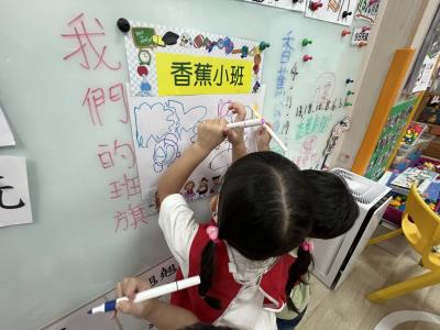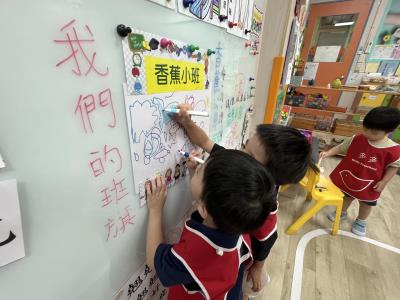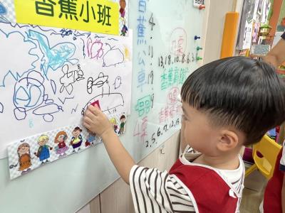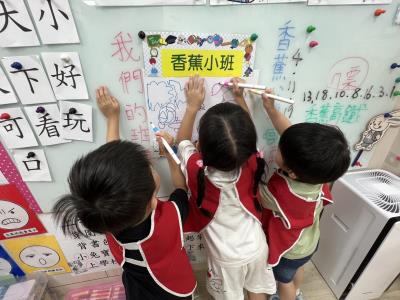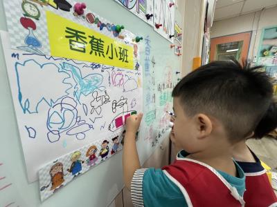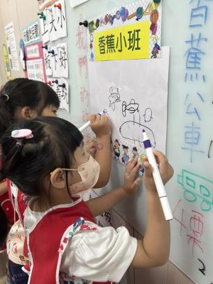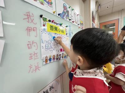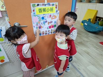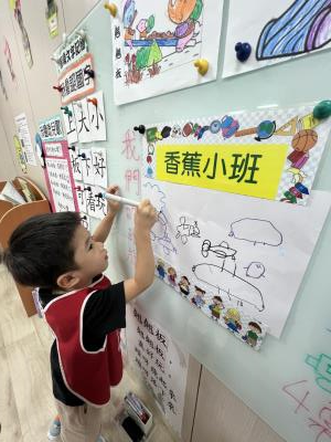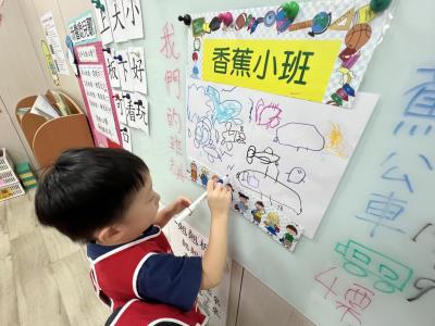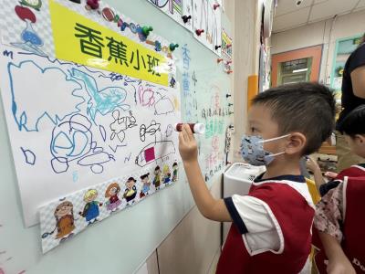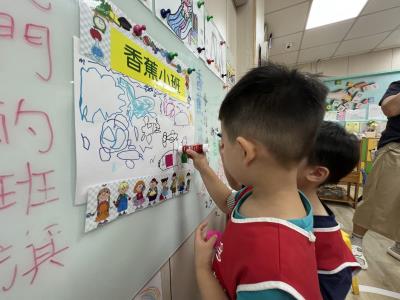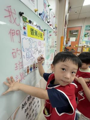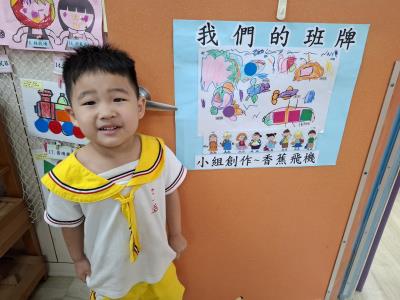 【114/09/22主題活動(一)我愛上學:我們會設計香蕉小班的班牌】可愛的小香蕉們已經開始熱烈的討論,我們教室有『香蕉小班』的香蕉船、 牧鴻:彎彎的香蕉像拱門 、立嵐:香蕉像溜滑梯 、蕃瑀:香蕉公車 、洵宇:香蕉高鐵 。孩子們經過熱烈討論,班牌圖案想仿畫飛機的圖案,一起合作運用線條、形狀、色彩表現不同的想法和創意並分享畫出不同型式的大小飛機及取名…艾莎飛機和汪汪隊飛機…在彩色天空遨遊飛翔,小小夢想起飛~~發揮無限想像和創意,凝聚孩子們對小班的向心力。