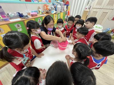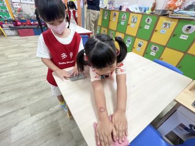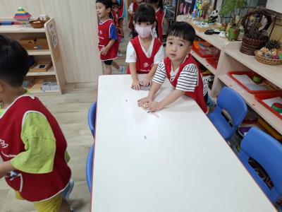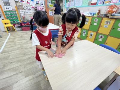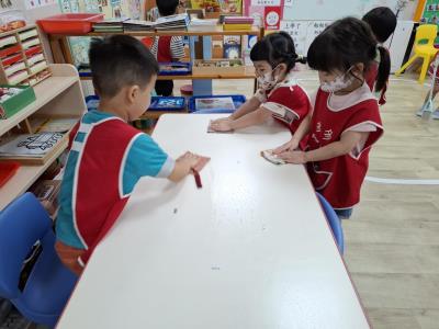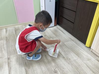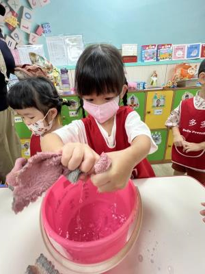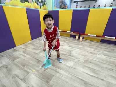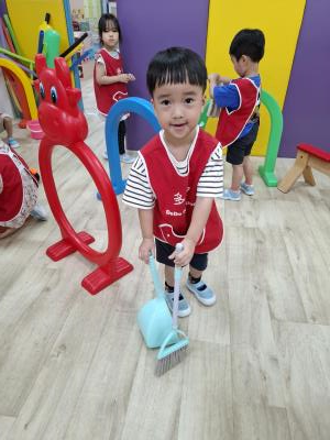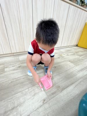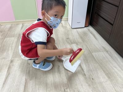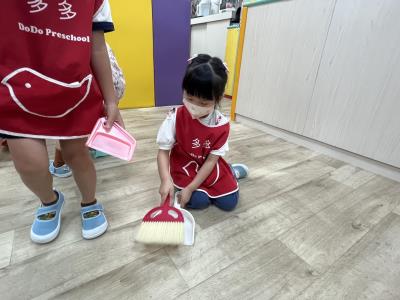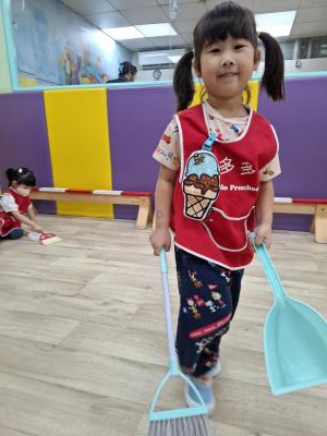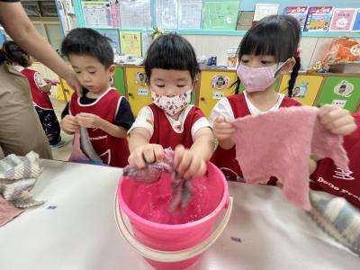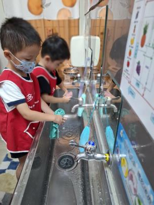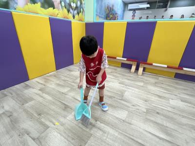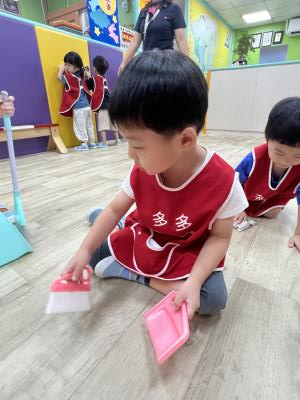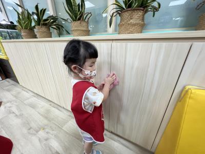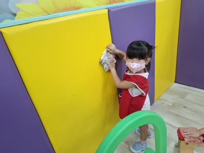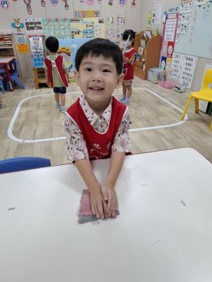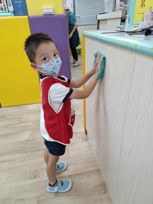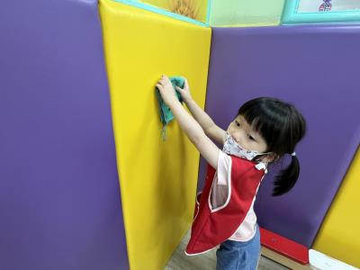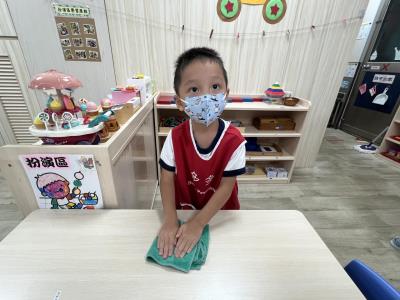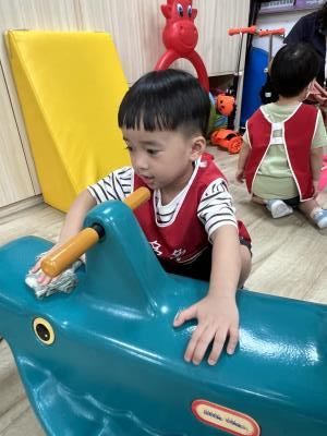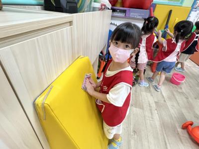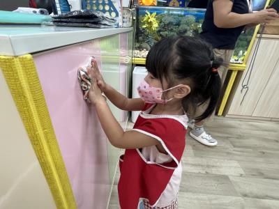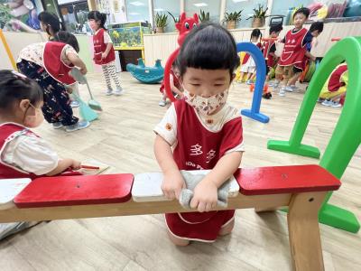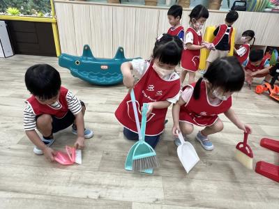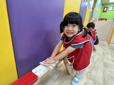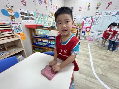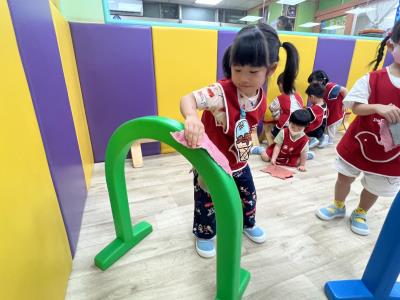 【114/09/23主題活動(一)我會愛護校園】老師說:「學校是大家的,我們一起來清潔乾淨」,老師分組發給幼兒抹布,然後帶領幼兒到洗手台示範練習擰乾抹布的方法,讓幼兒動手幫活動區器材哪裡髒髒,就把抹布對摺整齊再上下整齊擦拭,孩子們認真掃地和拿抹布擦拭每一樣器材,一點都不馬虎。看似簡單,卻一步步滋養孩子的責任心、自律與合作的精神,成為日後成長路上貴的養分唷!