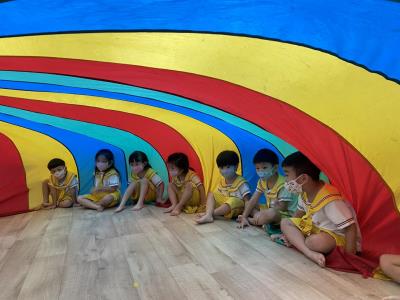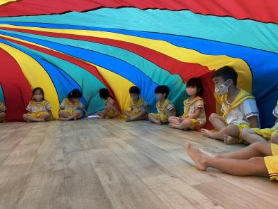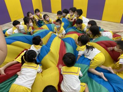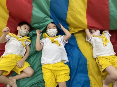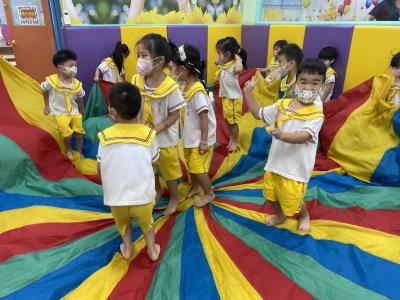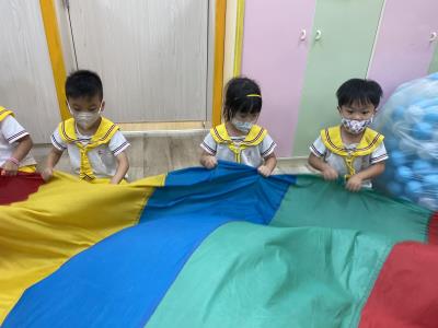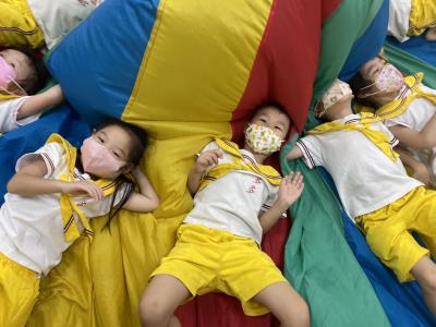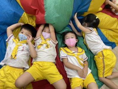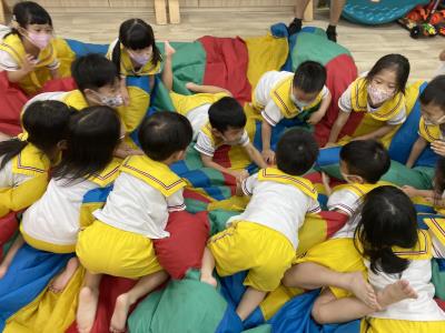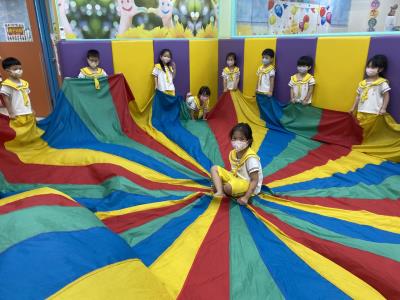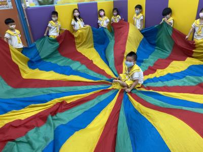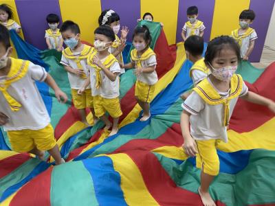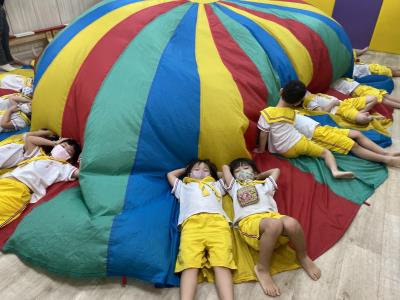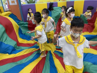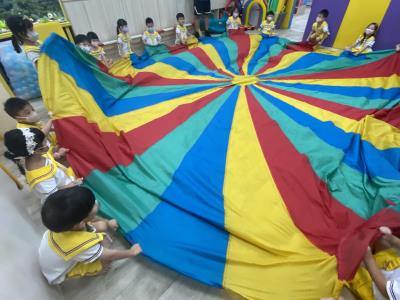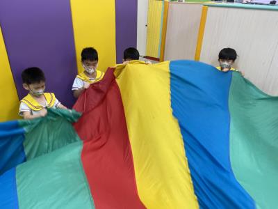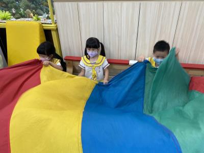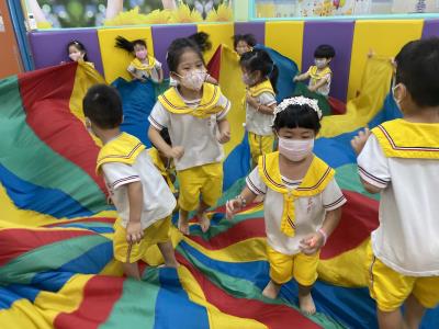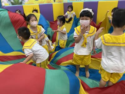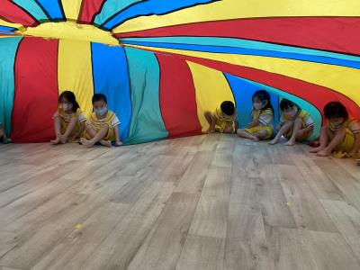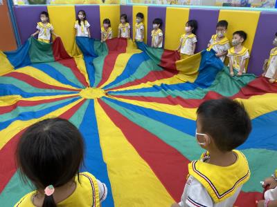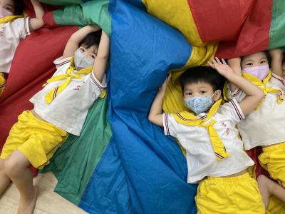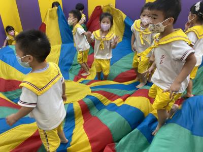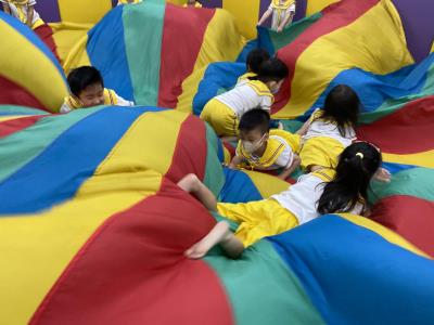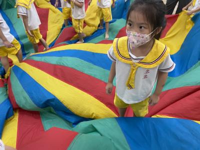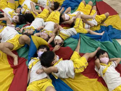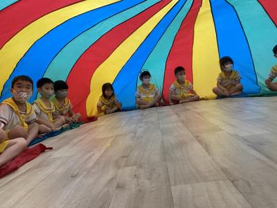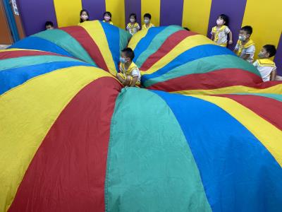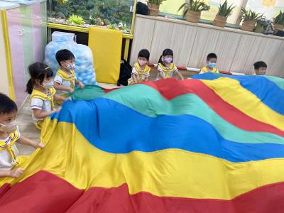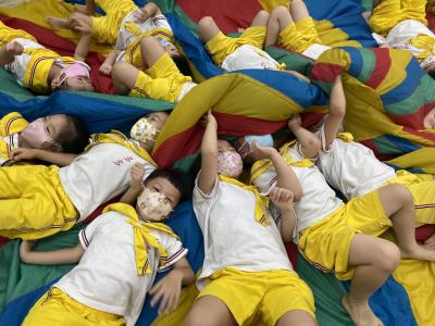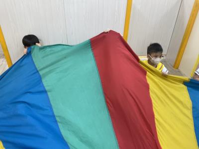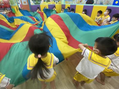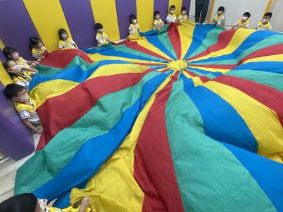 114.10.02體能活動~雙十國慶(氣球傘) 今天小朋友們一起玩「氣球傘」活動! 大家圍成一圈,雙手緊握彩色傘布,隨著音樂節奏揮動、舉高、放下、轉圈,孩子們在揮動傘布的同時練習手臂力量與節奏感,還要和同伴配合動作,讓傘面像波浪一樣起伏。 活動中大家玩得又開心又專注,體驗到合作與律動的樂趣