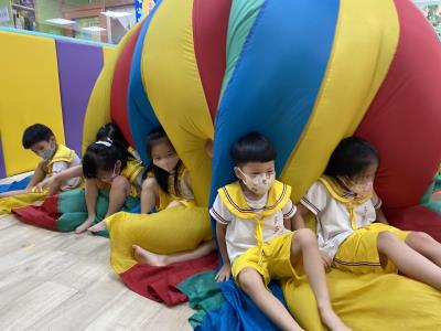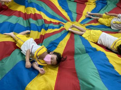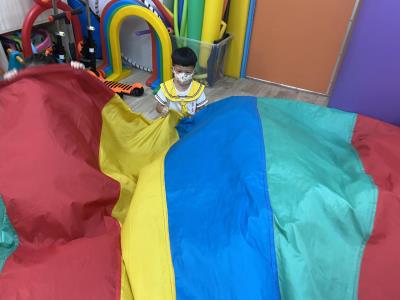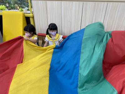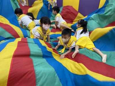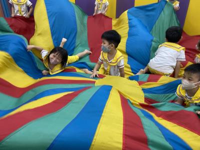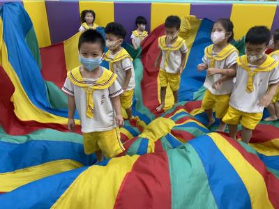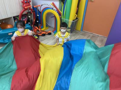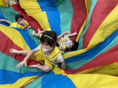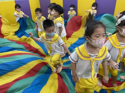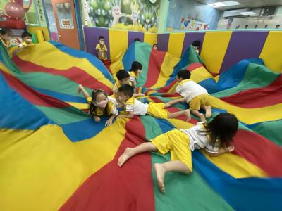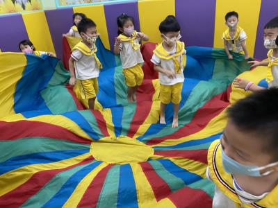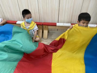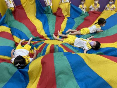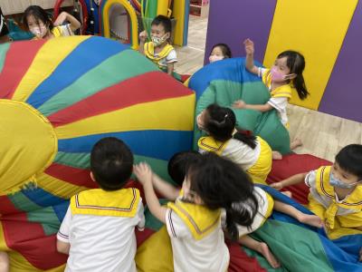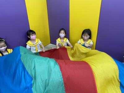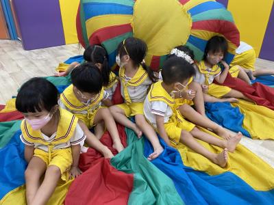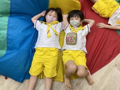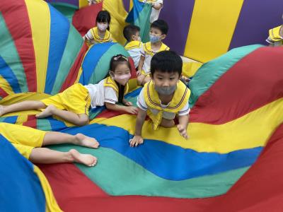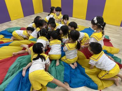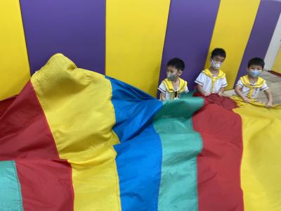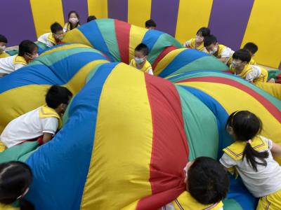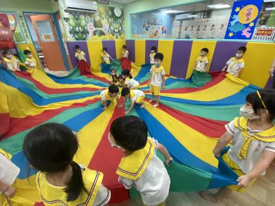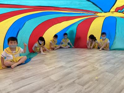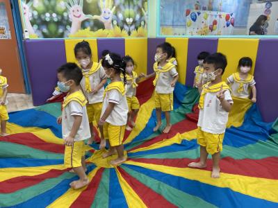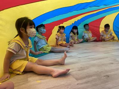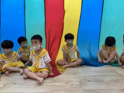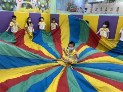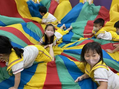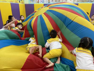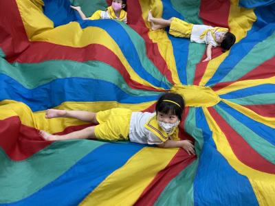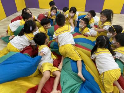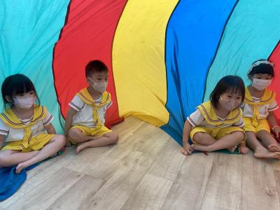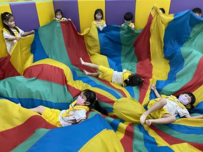 114.10.02體能活動~雙十國慶(氣球傘) 今天小朋友們一起玩「氣球傘」活動! 大家圍成一圈,雙手緊握彩色傘布,隨著音樂節奏揮動、舉高、放下、轉圈,孩子們在揮動傘布的同時練習手臂力量與節奏感,還要和同伴配合動作,讓傘面像波浪一樣起伏。 活動中大家玩得又開心又專注,體驗到合作與律動的樂趣