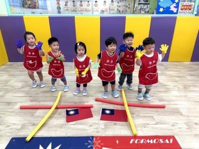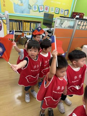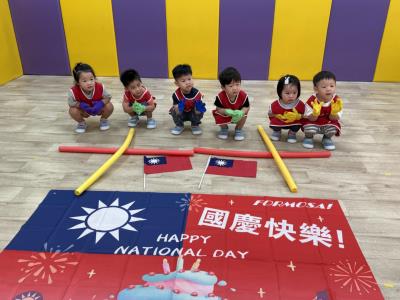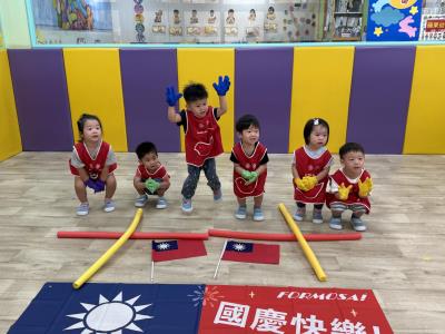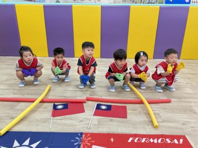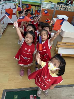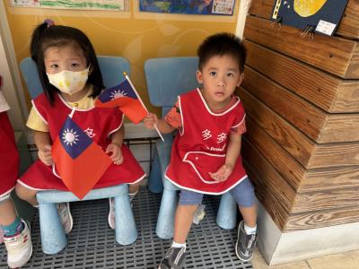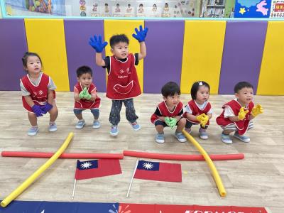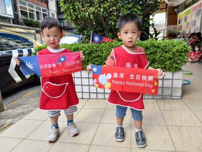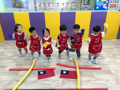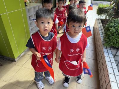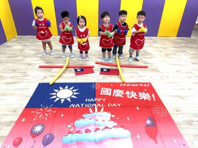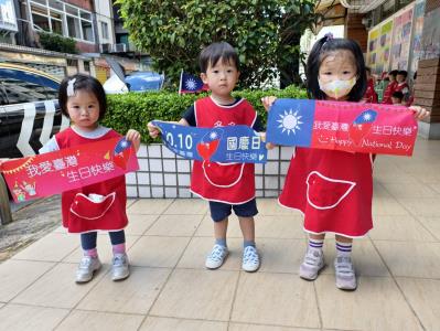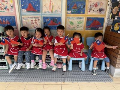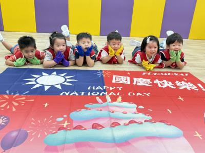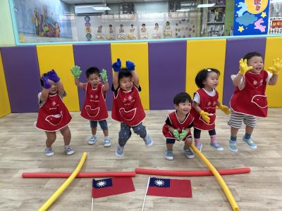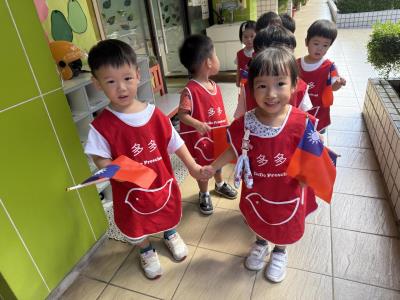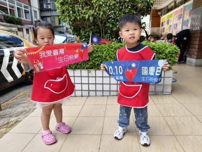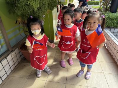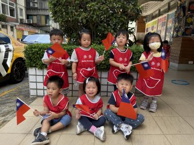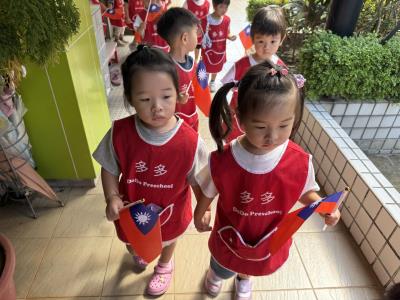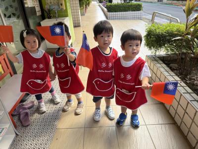 114.10.07節日活動~雙十節戶外(我們先認識國旗和顏色,接著孩子變成放煙發射和扭屁股像煙火般慶祝生日快樂,接著二班幼幼手拿國旗到戶外走走)
