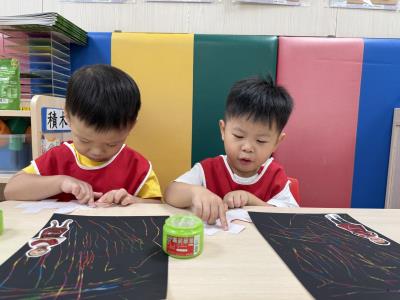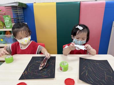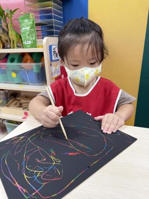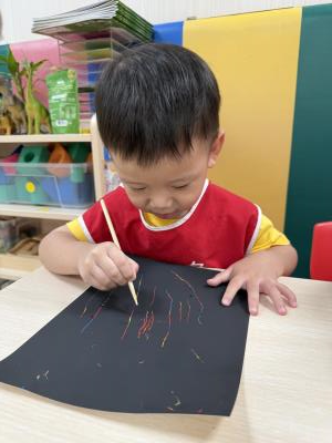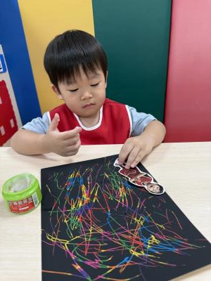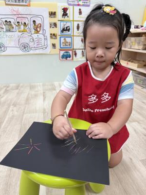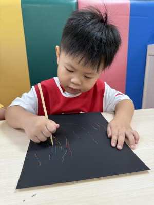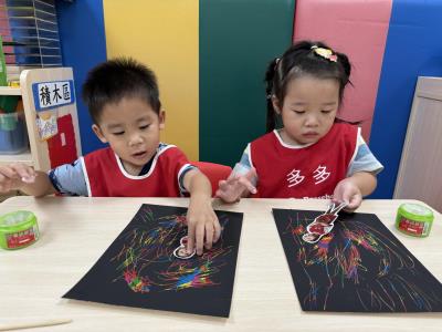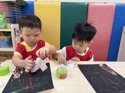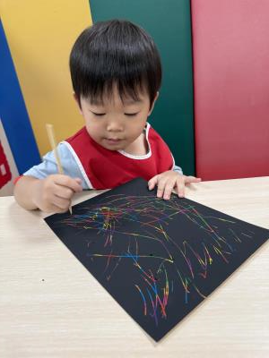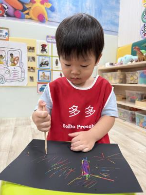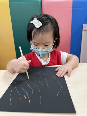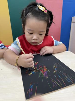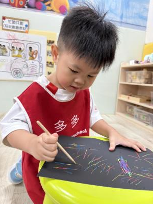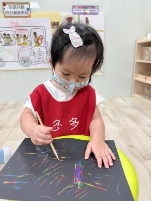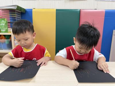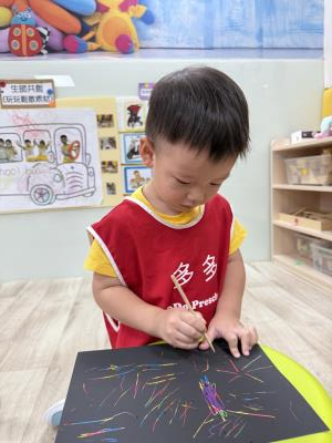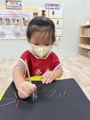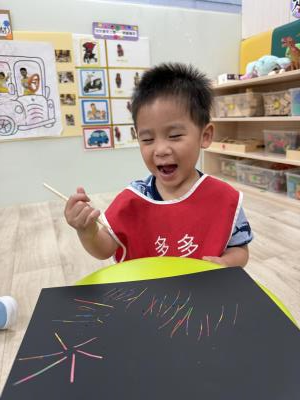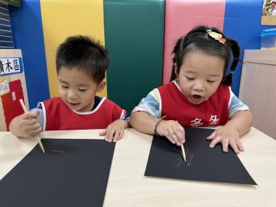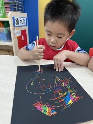 114.10.08國慶美勞~雙十節放煙火(刮畫)孩子們第一次此用刮畫先讓他們練習體驗感受,再來輪流花出彩色煙火後貼上照片和雙十像極了在欣賞繽紛絢麗的煙火