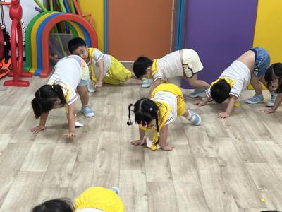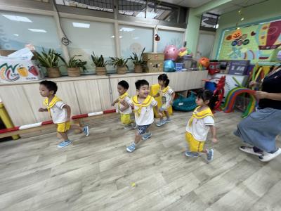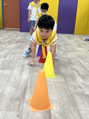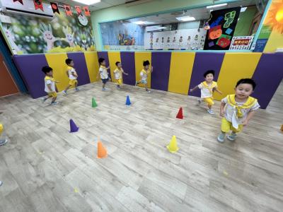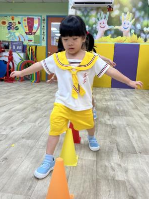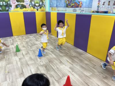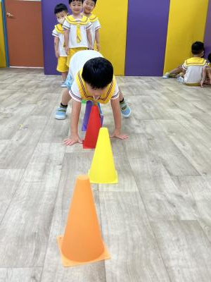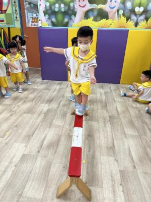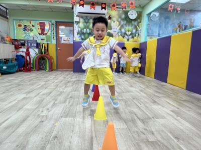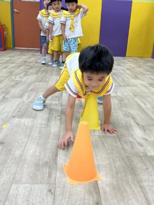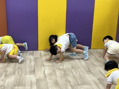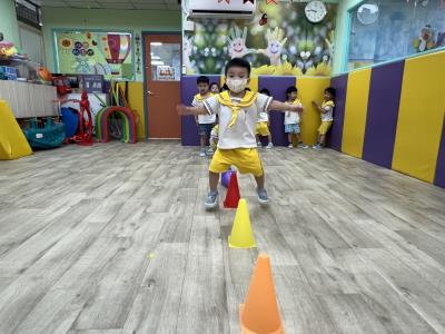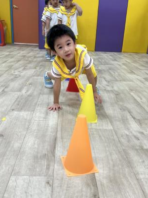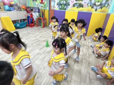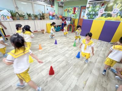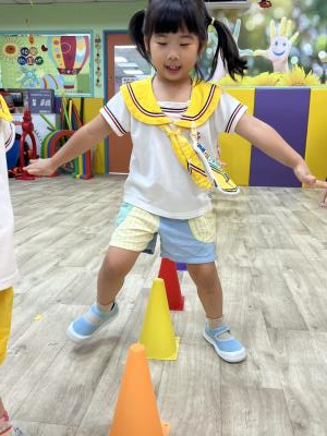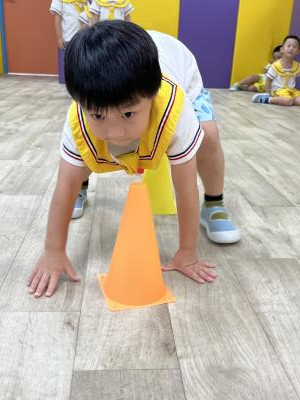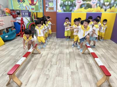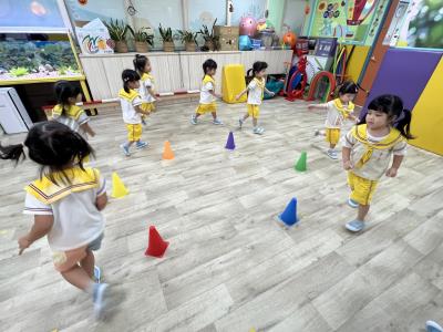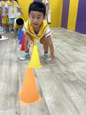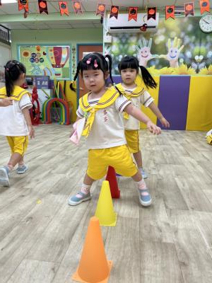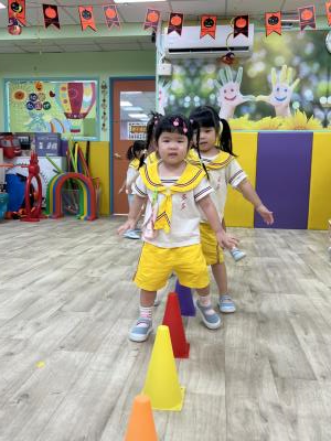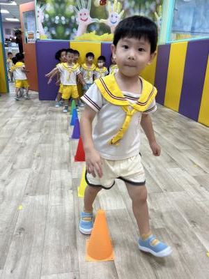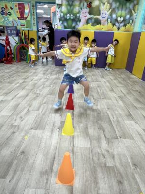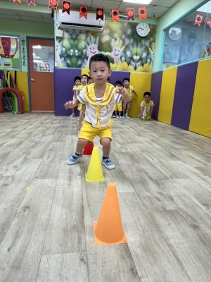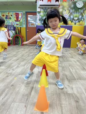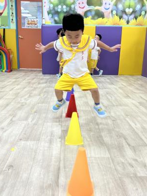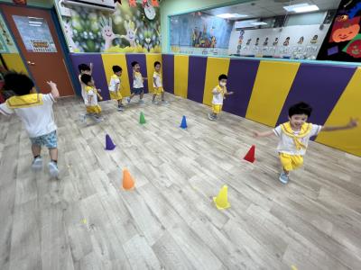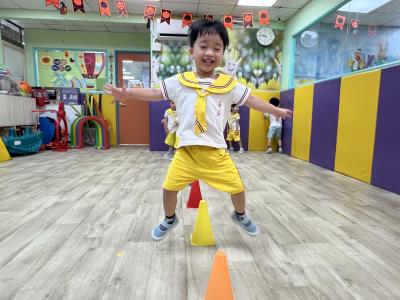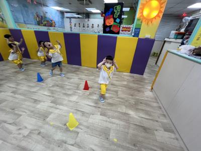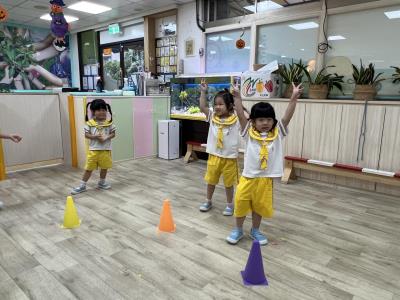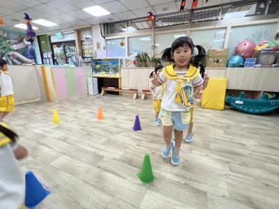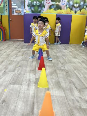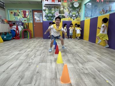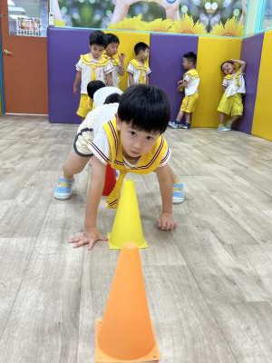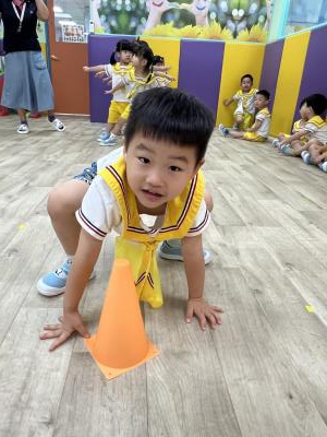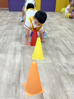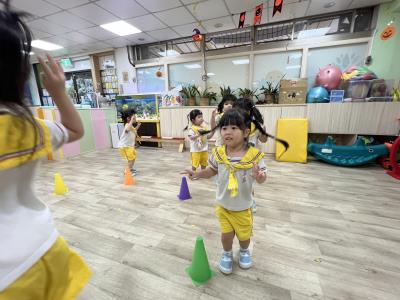 【114/10/20每日實施30分鐘出汗性大肌肉活動:彩色三角錐&平衡木】香蕉小兵像小兔子一樣跳過彩色三角錐再用四肢爬行穿越及環狀運動繞著三角錐跑大肌肉運動,走平衡木從開始害怕到現在不用扶能穩定自己走還不會掉下來,香蕉小兵有進步囉!運動我最棒!