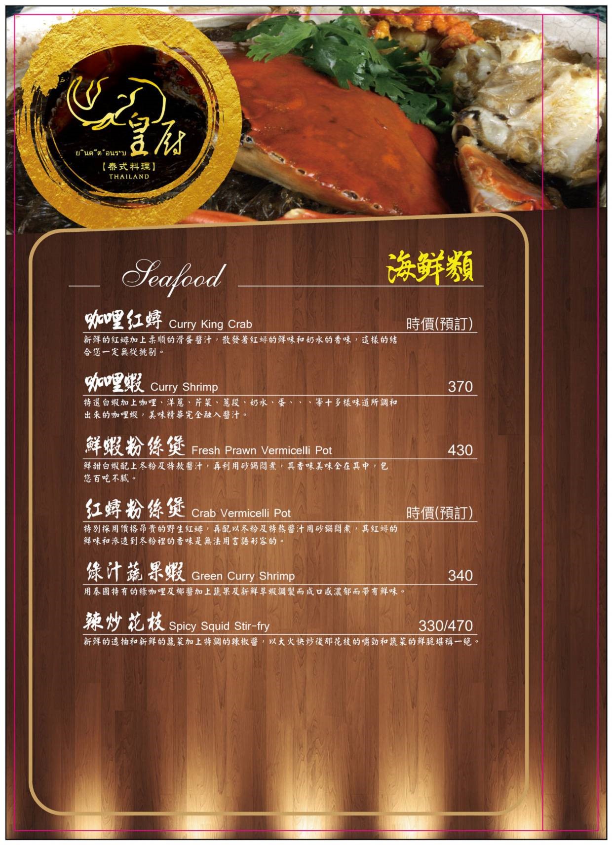 皇廚泰式料理成立於91年10月 , 開店至今 ,已擁有了上千位的會員加入, 除了店內的服務品質,我們更要求食材的新鮮及用料,對美食擁有高度熱情的皇廚,極力找尋高品質的食材,全心全意將它烹調的極至完美,就是為了帶給客人有最高規格的美食饗宴,這份對美食的堅持,就是皇廚對您的最佳保證。