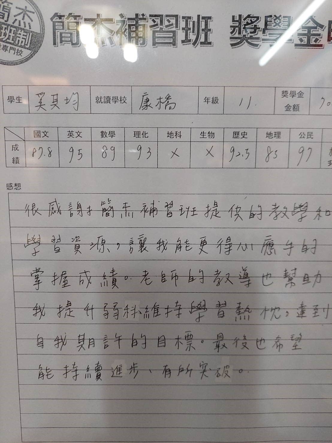 立人國中 楊*續 54=》94 -98分 進步44分